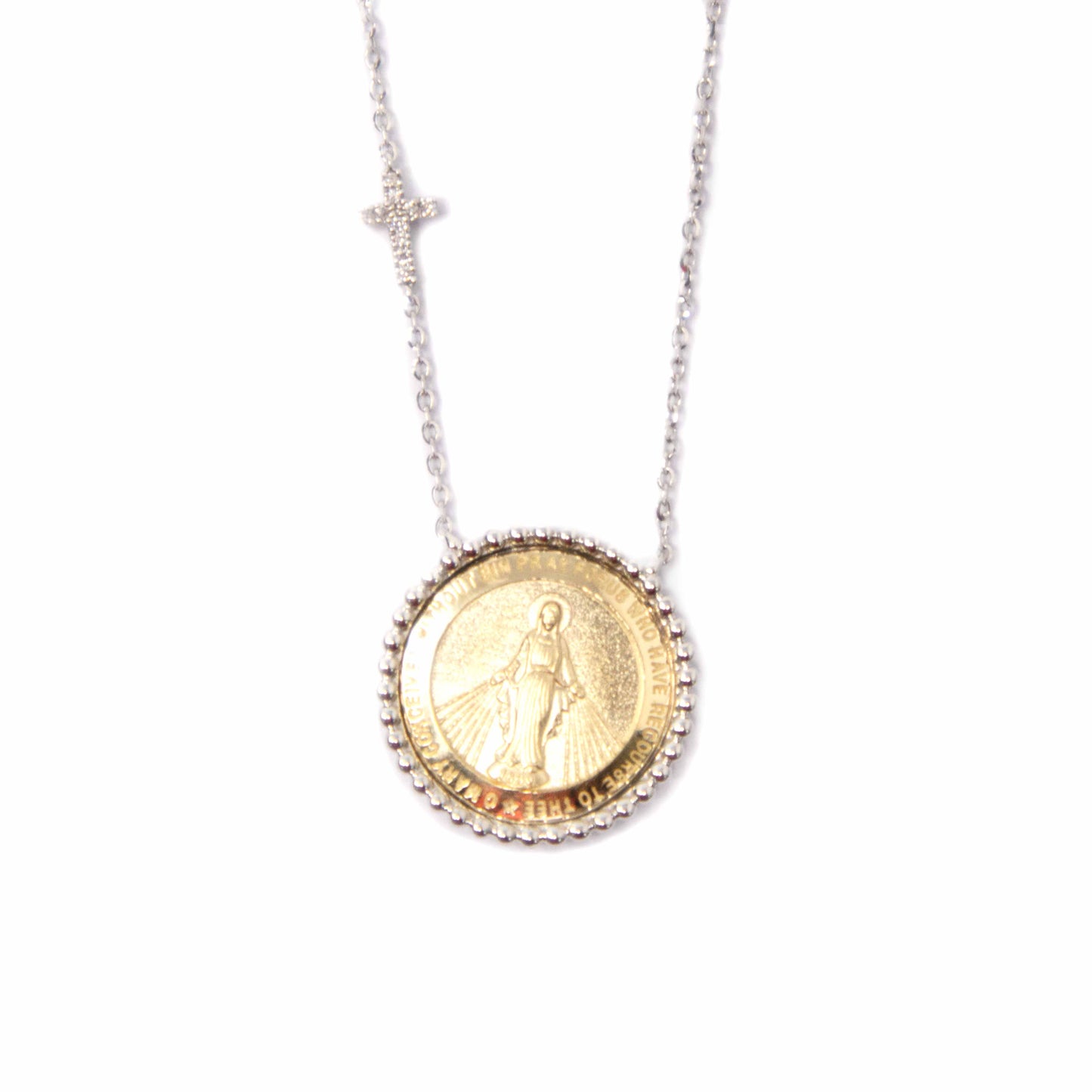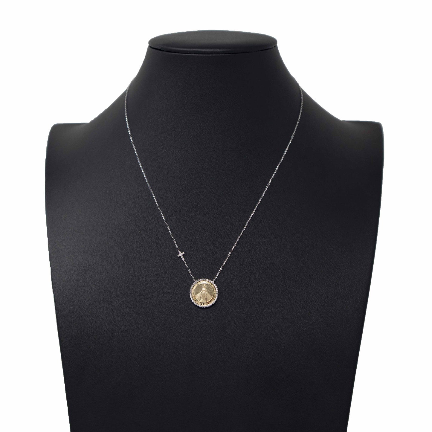 14K Two Tone Gold Virgin Mary and Diamond Cross Pendant Necklace