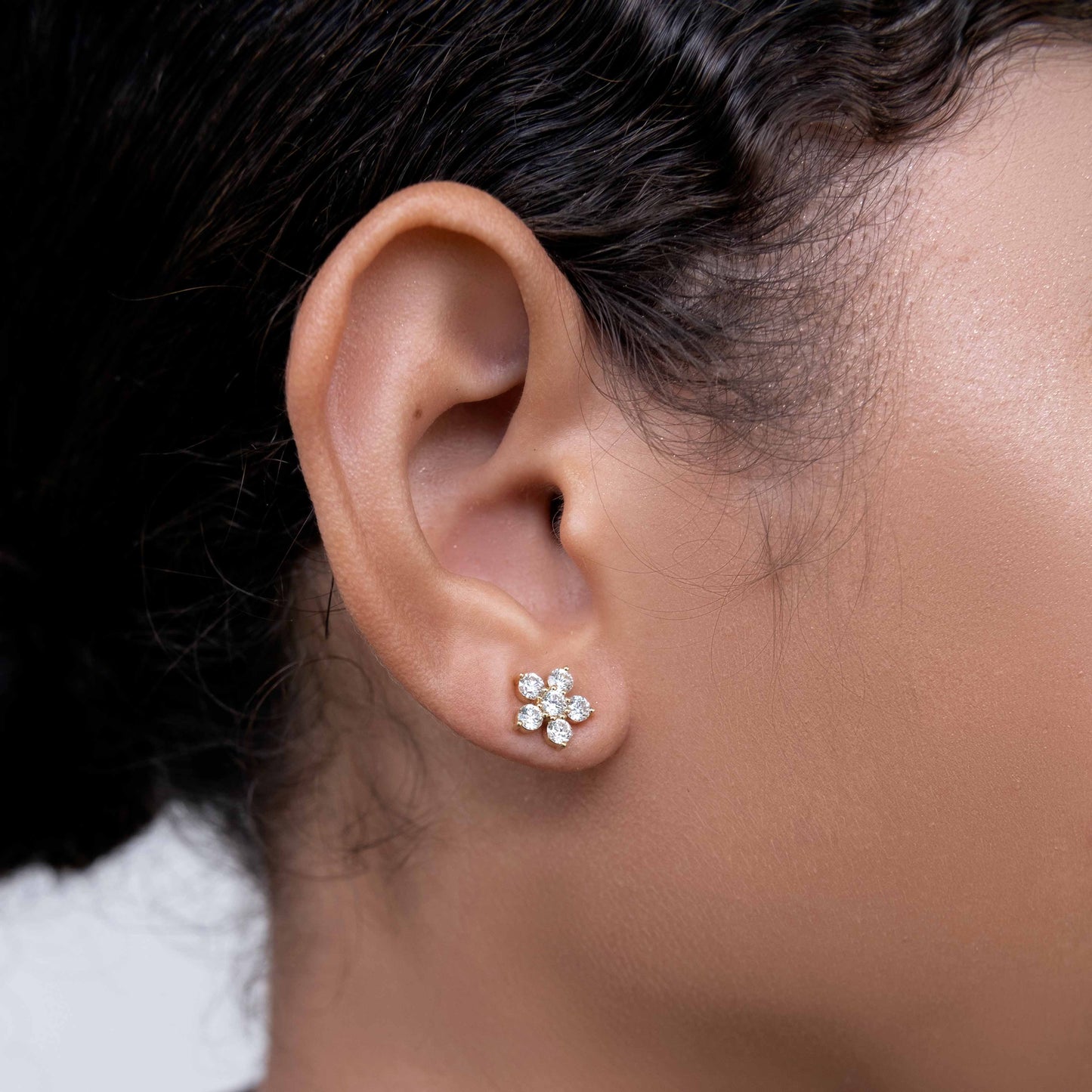 Our diamond flower earrings offer elegant style with a touch of whimsy. Each flower comprises of 6 hand-set diamonds. Bright and beautiful, these diamond stud earrings will ad stunning sparkle to your ear. Adopt these elegant earrings as your everyday look.