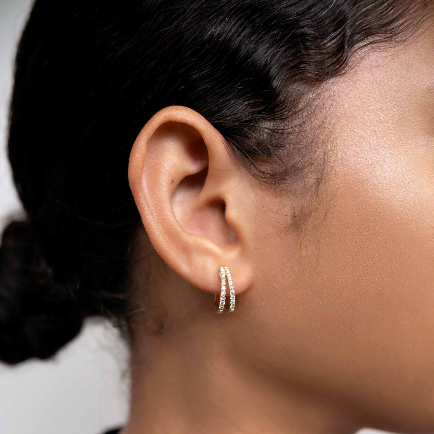 Double up with these fun and elegant hoop earrings featuring two rows pave diamonds, adding a stacked-up statement vibe to any ear stack. Wear alone or stacked with ear cuffs for a fully curated ear.