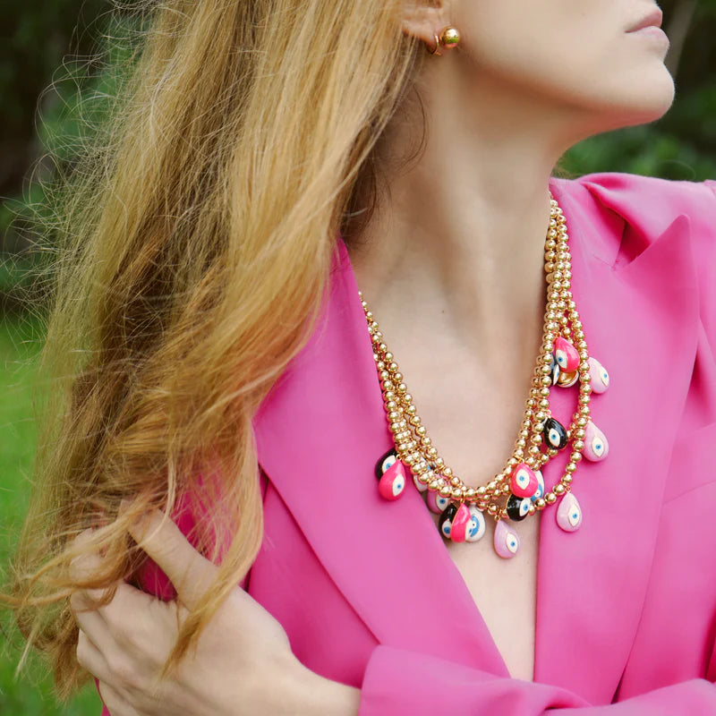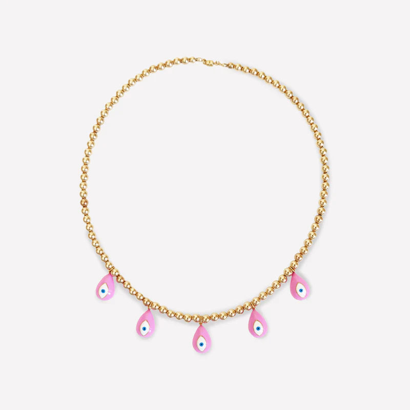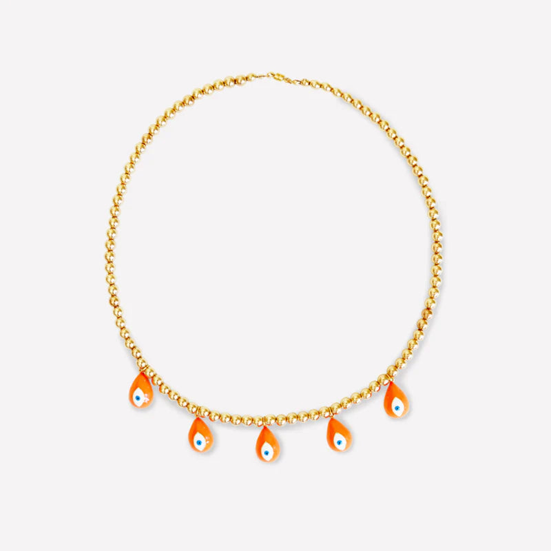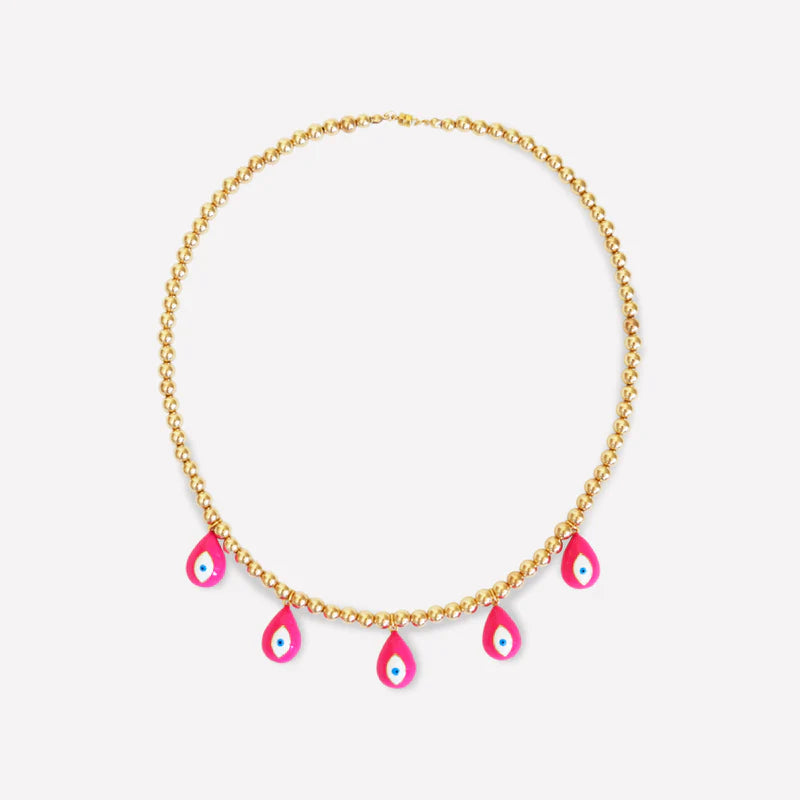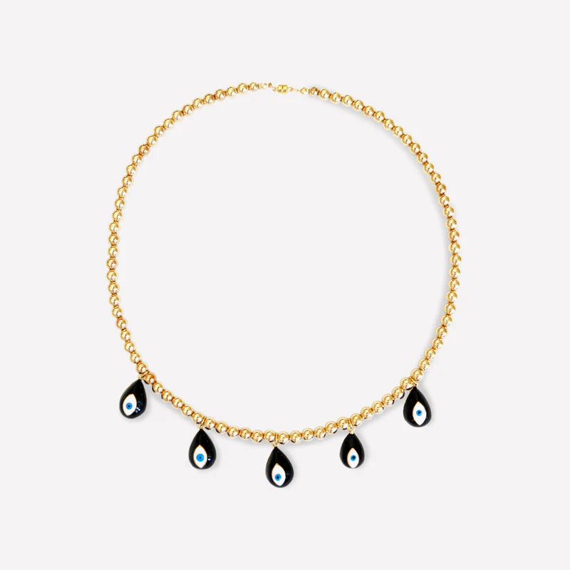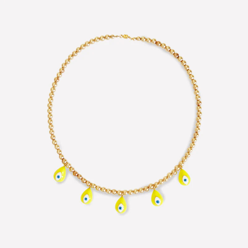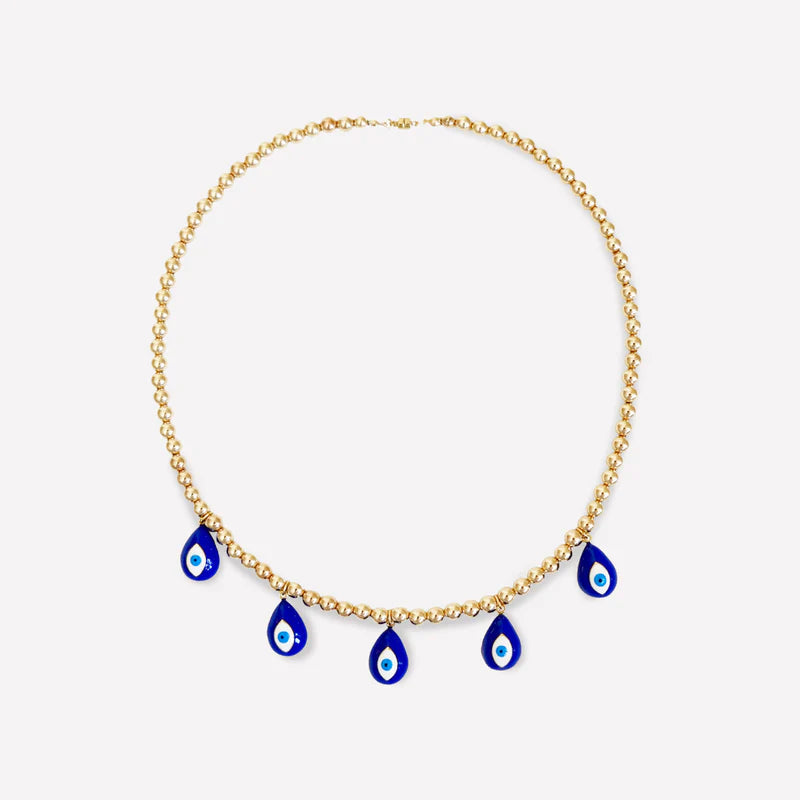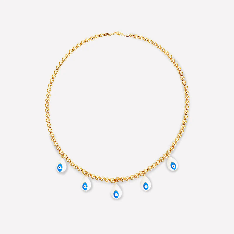 Add a touch of charm to any look with this elegant RANIA EYE NECKLACE. Crafted with 5 dangling evil eye glass charms on a delicate yellow gold plated beaded necklace for a sophisticated, tasteful finish, this timeless piece will be your go-to for effortless elegance.