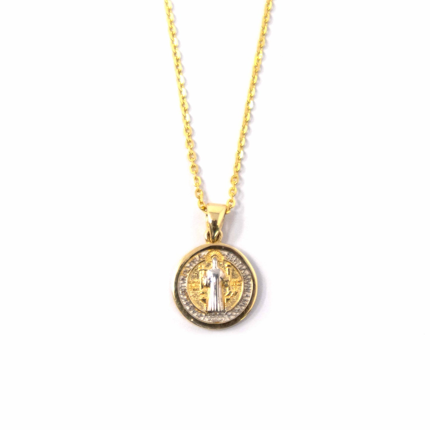 Adorn yourself with this stunning 14K two-tone St. Benedict pendant, a symbol of faith and protection. Perfect for everyday wear or as a meaningful gift for a loved one, this pendant serves as a reminder of St. Benedict's teachings and the strength of one's faith.