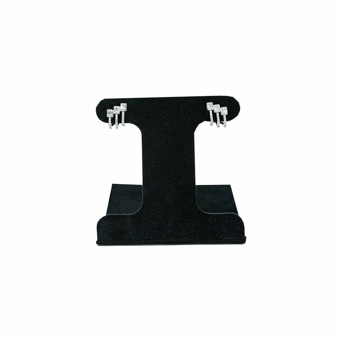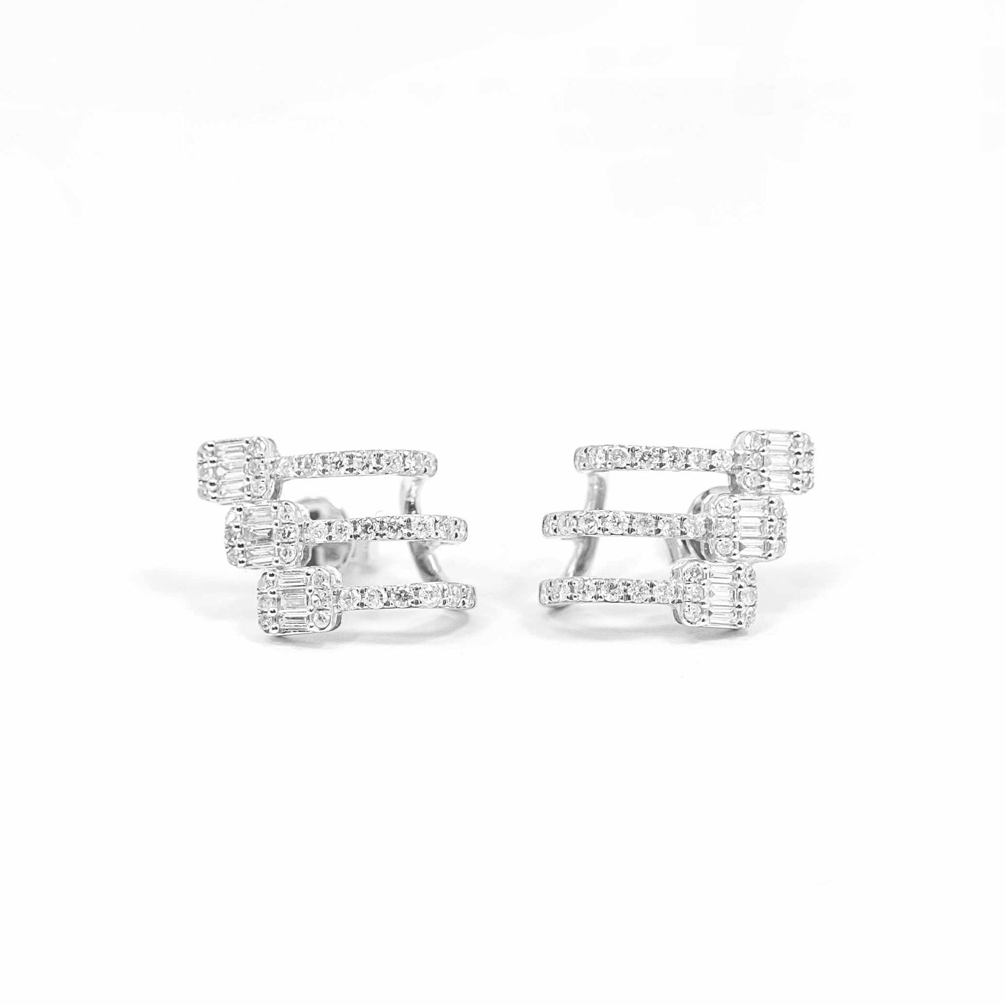 Bold and modern, triple row diamond Huggies in 14k white gold set with round and baguette diamonds totaling 0.72 ct. Perfect to wear from day to night.