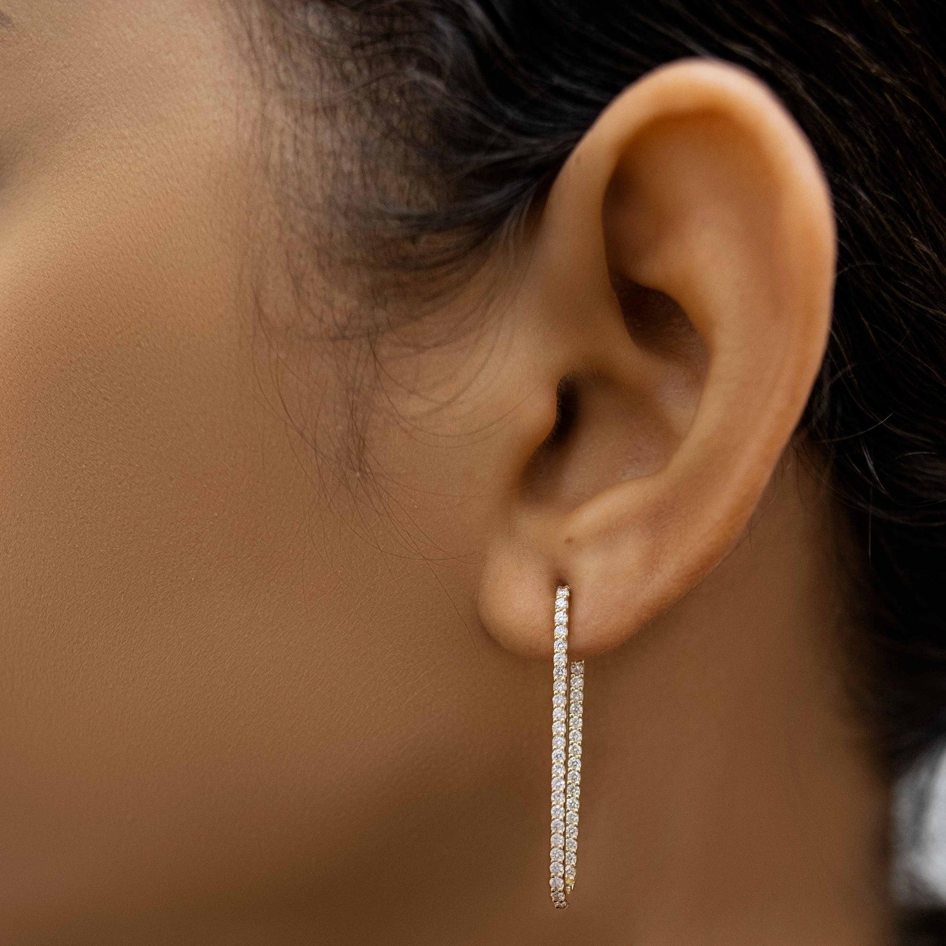 Geometric take on a classic huggie diamond earring, the long oval shape is a fun addition to your everyday look. An eye-catching addition to any ensemble while adding a touch of glamour and sophistication to your look.