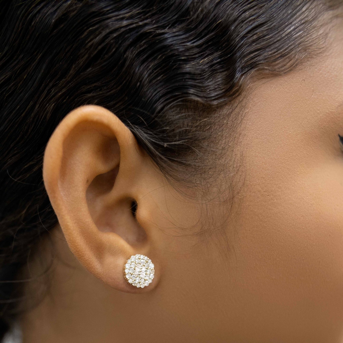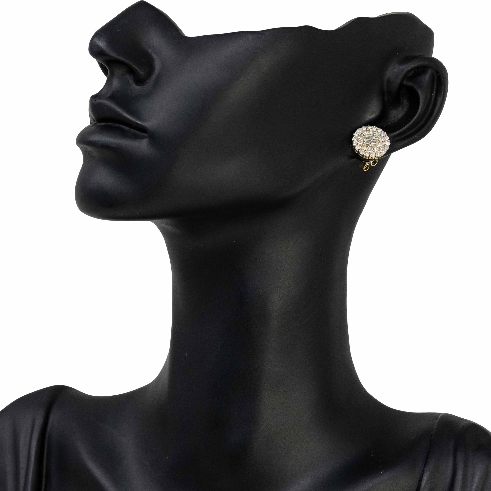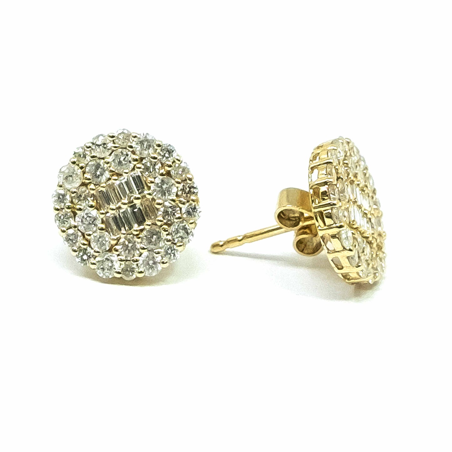 Discover timeless elegance with our 14K yellow gold round diamond and baguettes stud earrings. Shop now for sophisticated style.