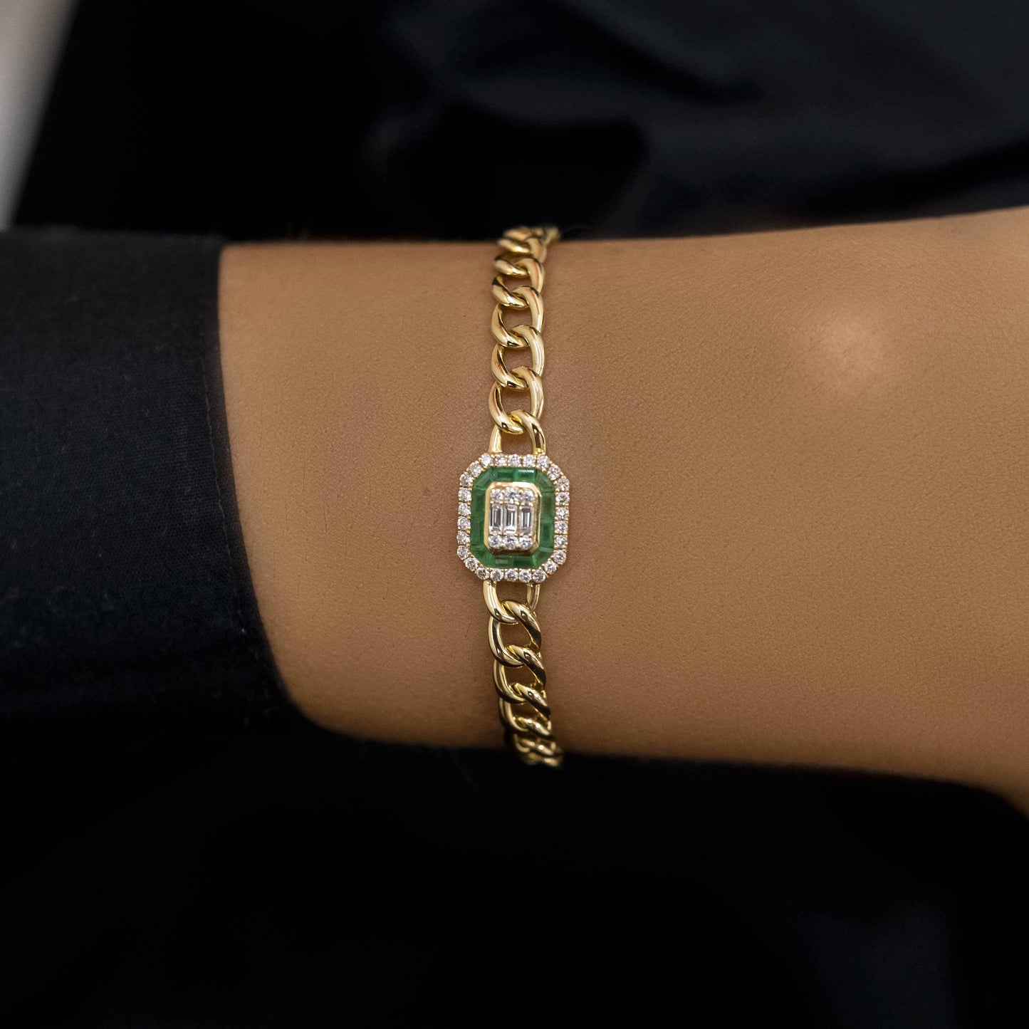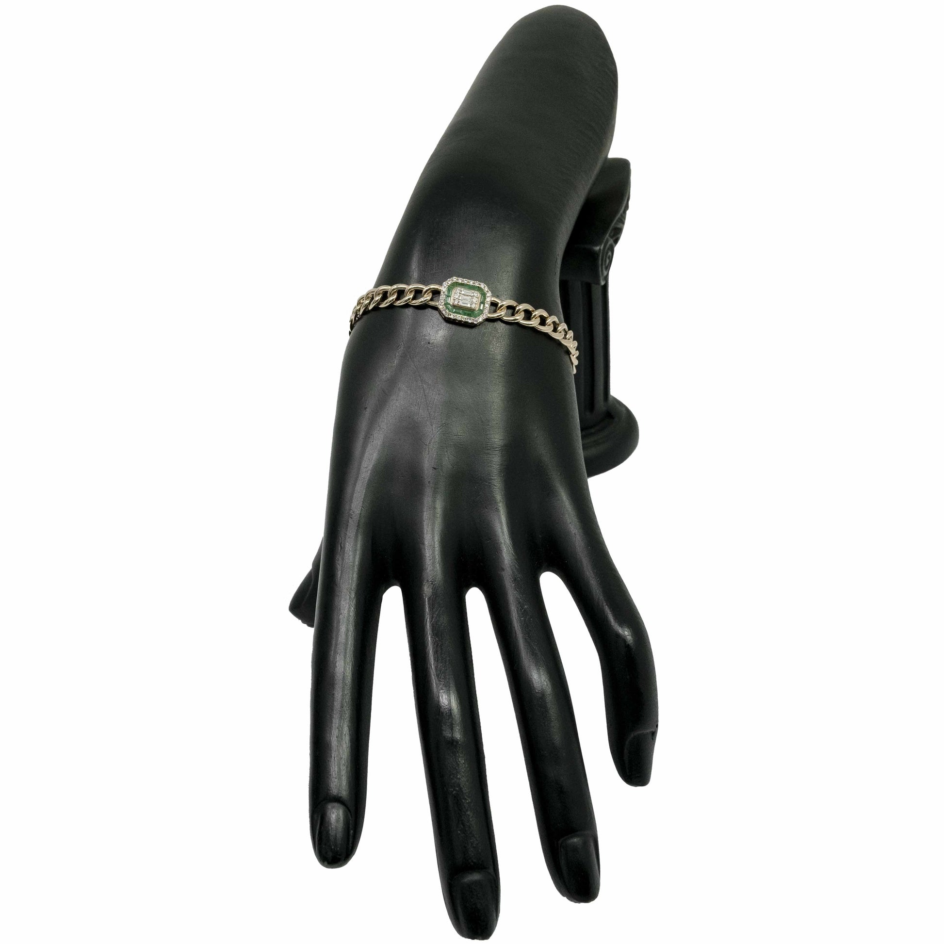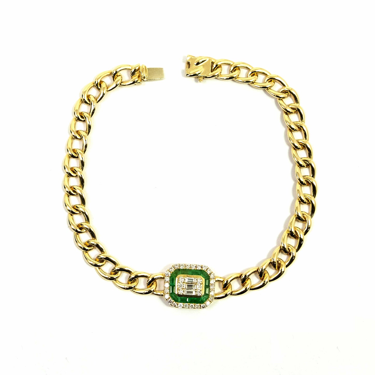 Versatile and fashionale cuban bracelet perfect for every style. The setting allows the right amount of light to hit the gem in just the right angles. The rich emerald green creates a beautiful contrast with the yellow gold cuban link. 14K Yellow Gold Emerald and Diamond Bracelet.