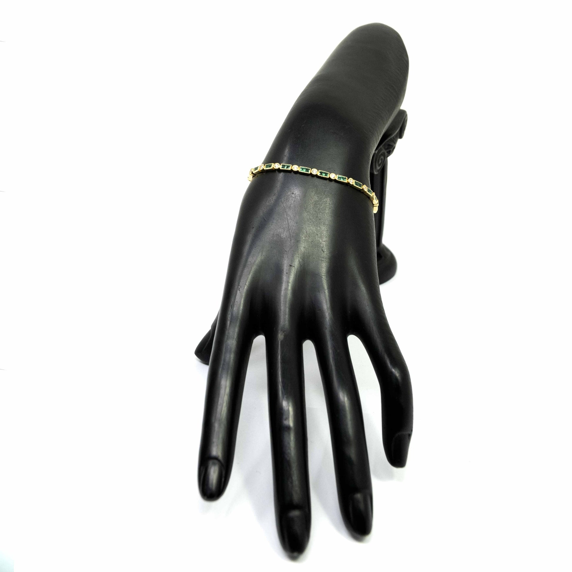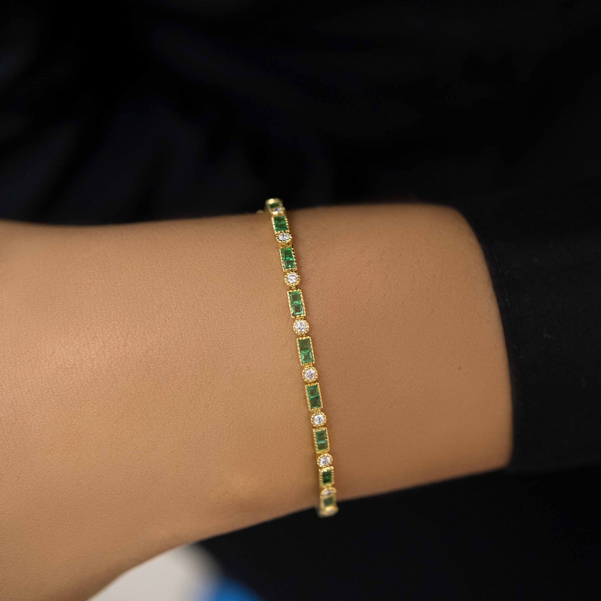 Emeralds and diamonds, are one of the most classic of all gem combinations. This 2.80 ctw green emerald bracelet is highlighted by its 0.70 ctw diamond, set in 18k yellow gold. Secured with a push in clasp and safety catch. Simple yet elegant, making for a staple piece in daily wear.