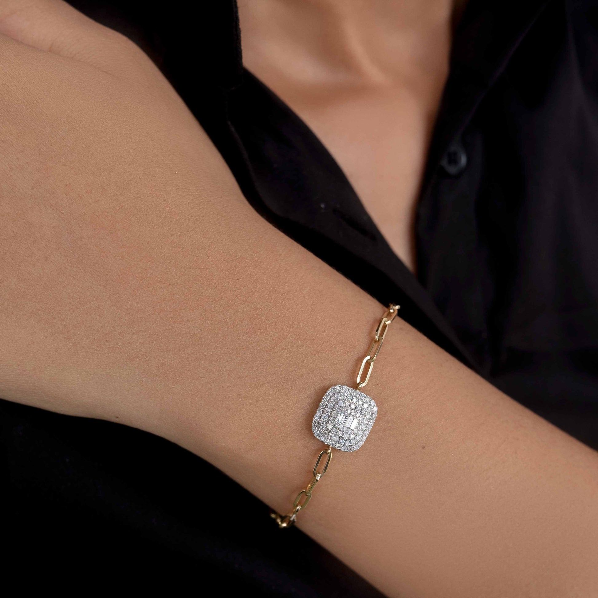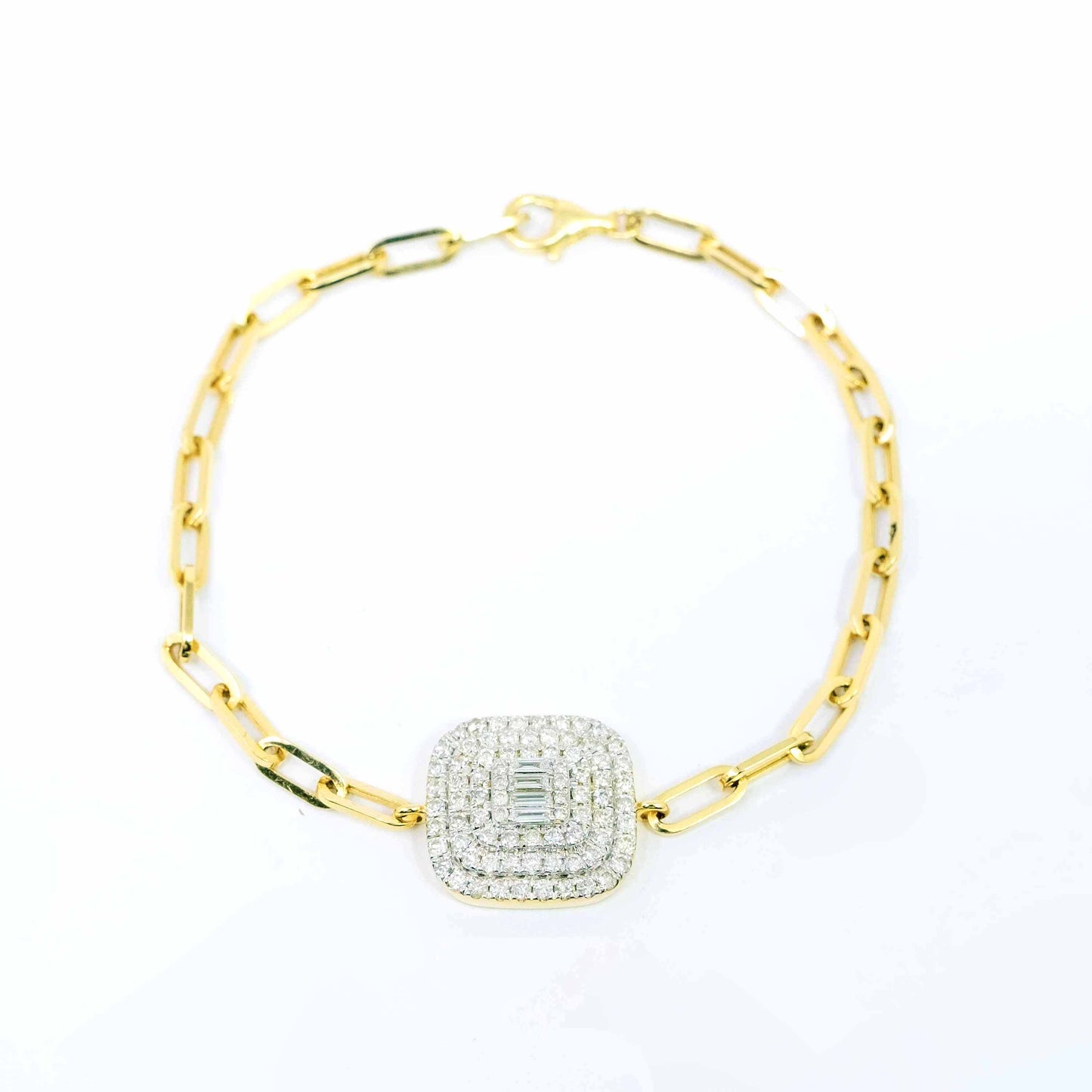 Paperclip jewelry is the latest fashion trend, so just hop on this train. 14k yellow gold bracelet with round and baguette diamond center halo. A must have, wear alone or stacked with other bracelets.