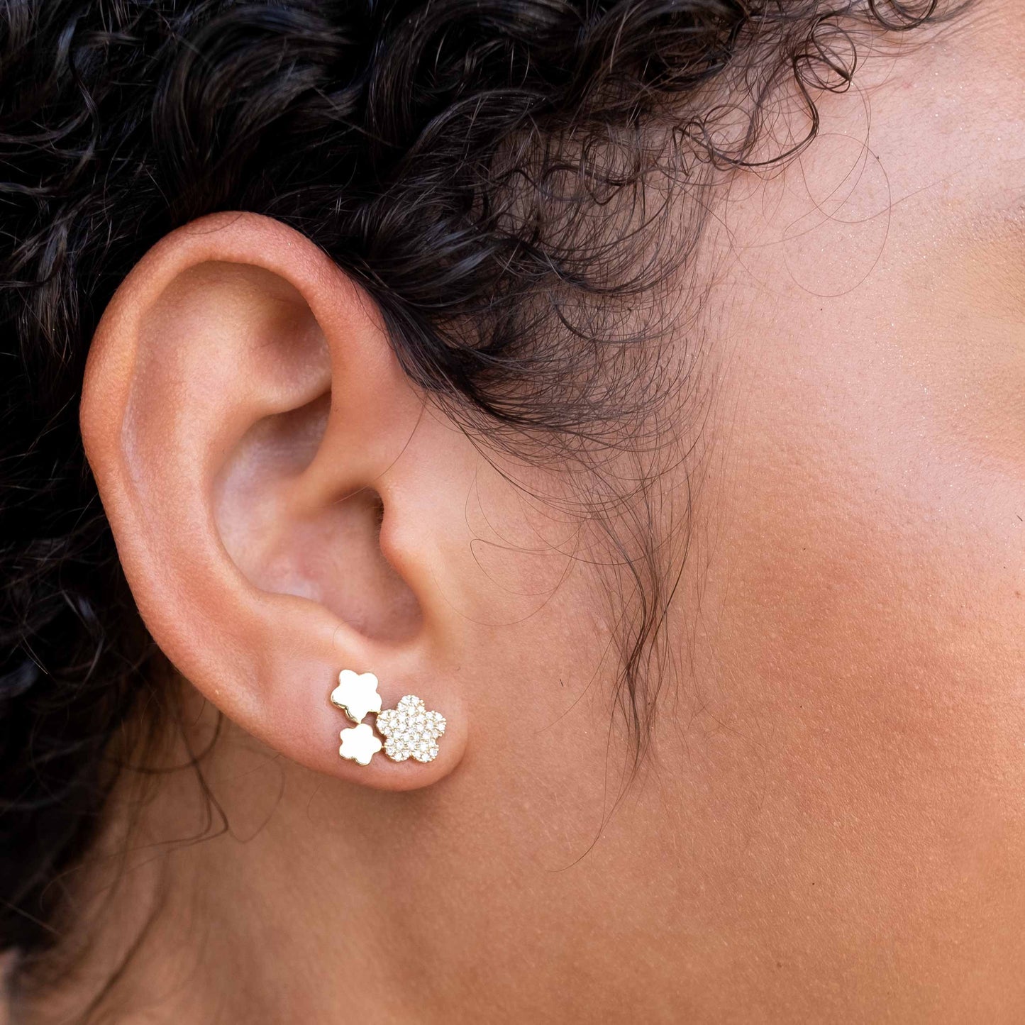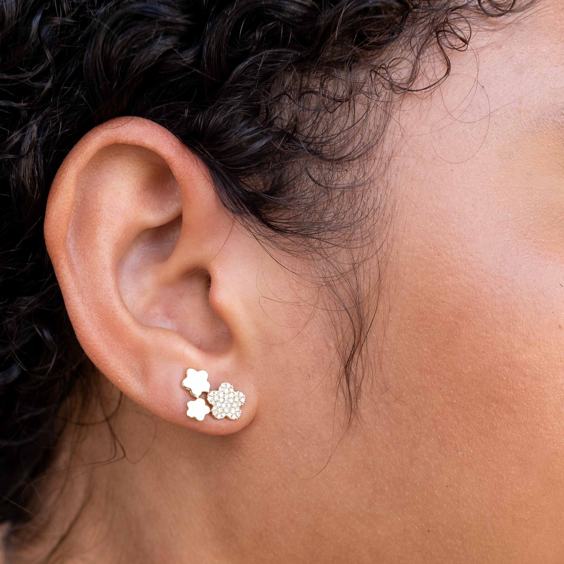The sweetest 18k yellow gold three flowers burst into bloom earrings. This standout design looks brilliant as the centerpiece of a curated ear, or as an eye catching solo piece.