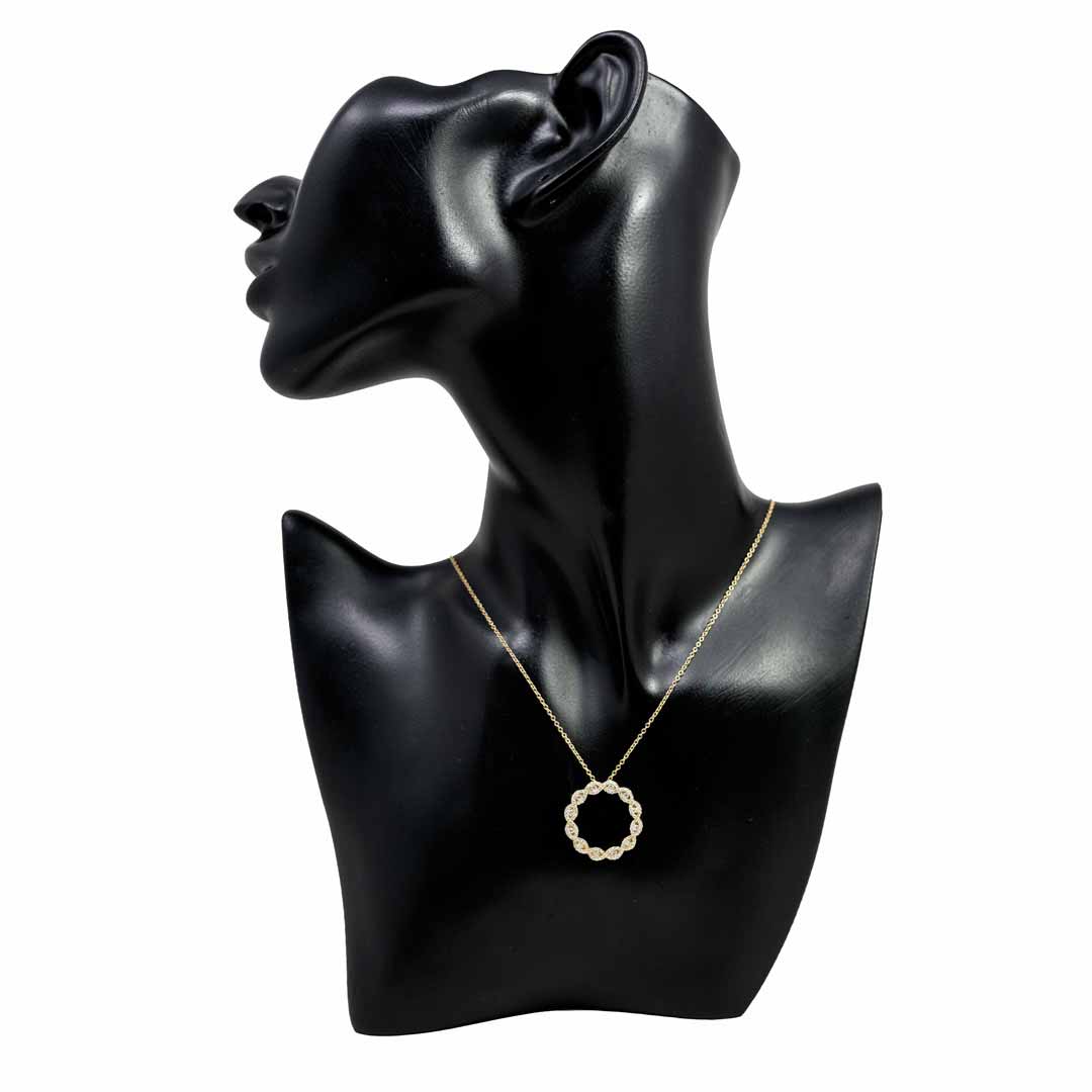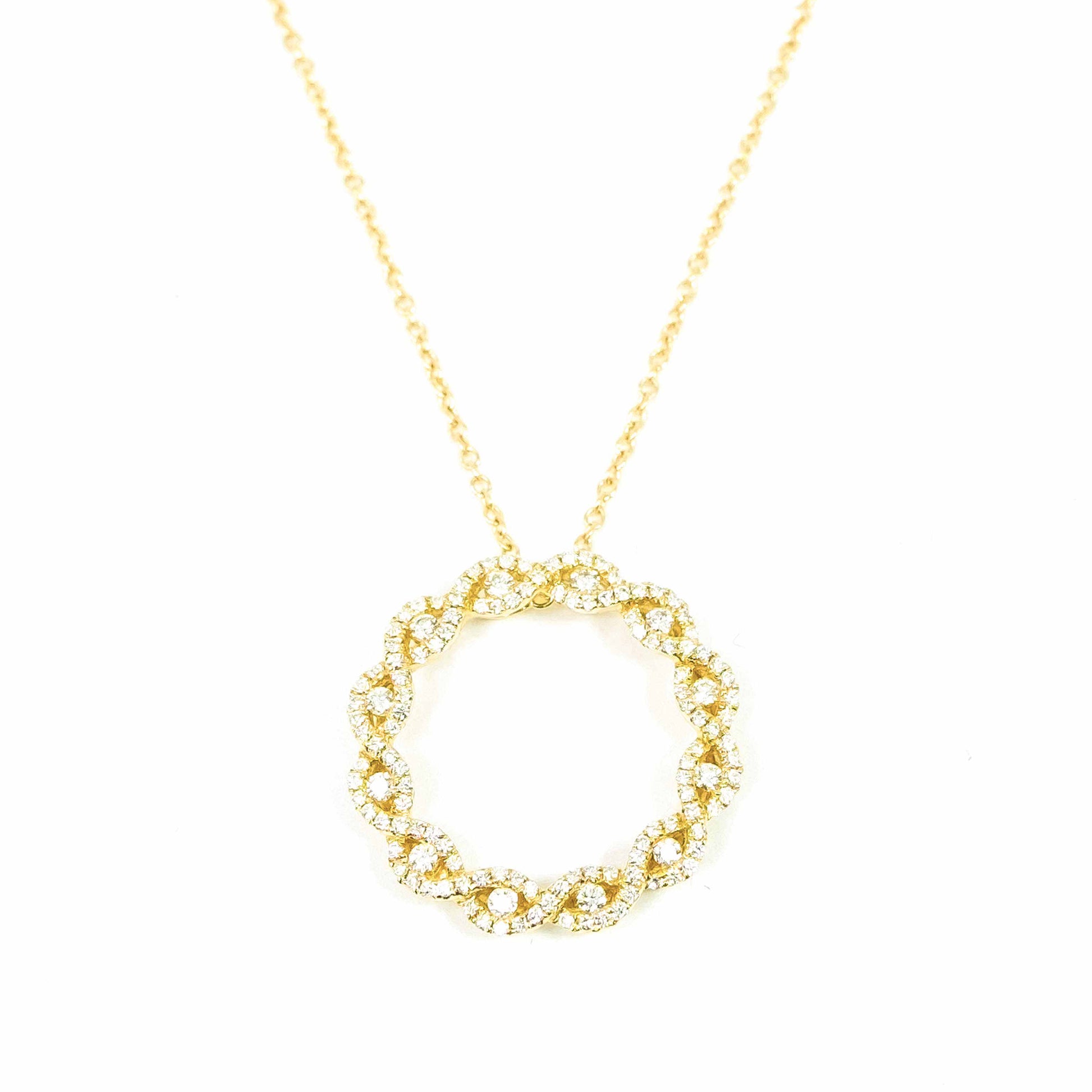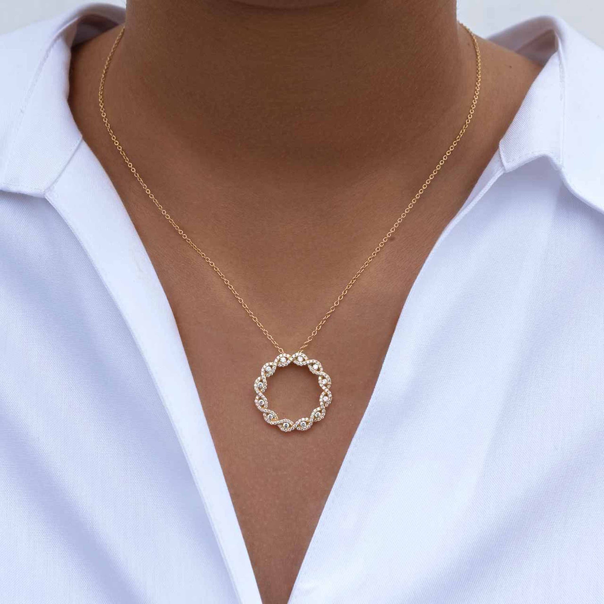 This breathtaking diamond necklace features a twisted circular pendant to serve an expression of your enduring gratitude. Each curve and twist draws in the rays of light making each diamond cut a beam of luminosity. Brilliant round cut diamonds weave throughout the twisted pendant in two ribbons for a total of 0.61 carat. This piece is the perfect way to add a touch of class to your outfit.