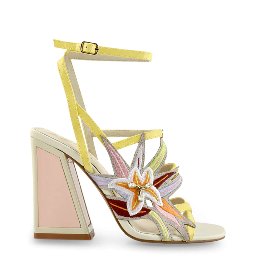 Experience the uniqueness of these sandals, feature a broad heel with multicolored floral details, perfect for those who value both comfort and elegance.