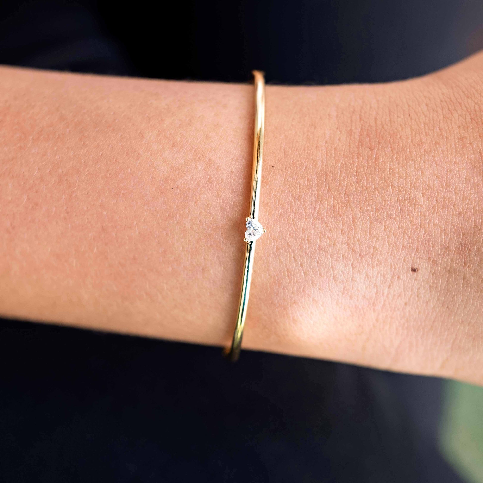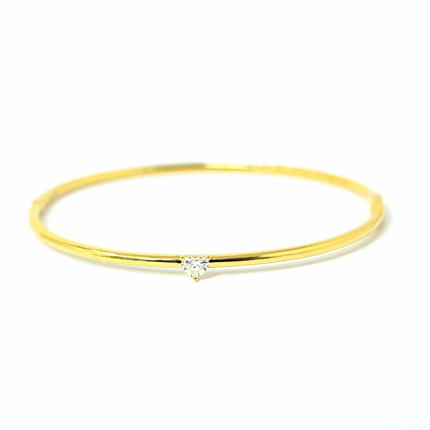 This timeless beauty of the yellow gold coupled with the subtle sparkle of the diamond heart makes it a perfect accessory for both formal and casual occasions, and a thoughtful gift for someone special. Whether worn alone or stacked with other bracelets, this bangle is sure to add a touch of luxury to any jewelry collection.