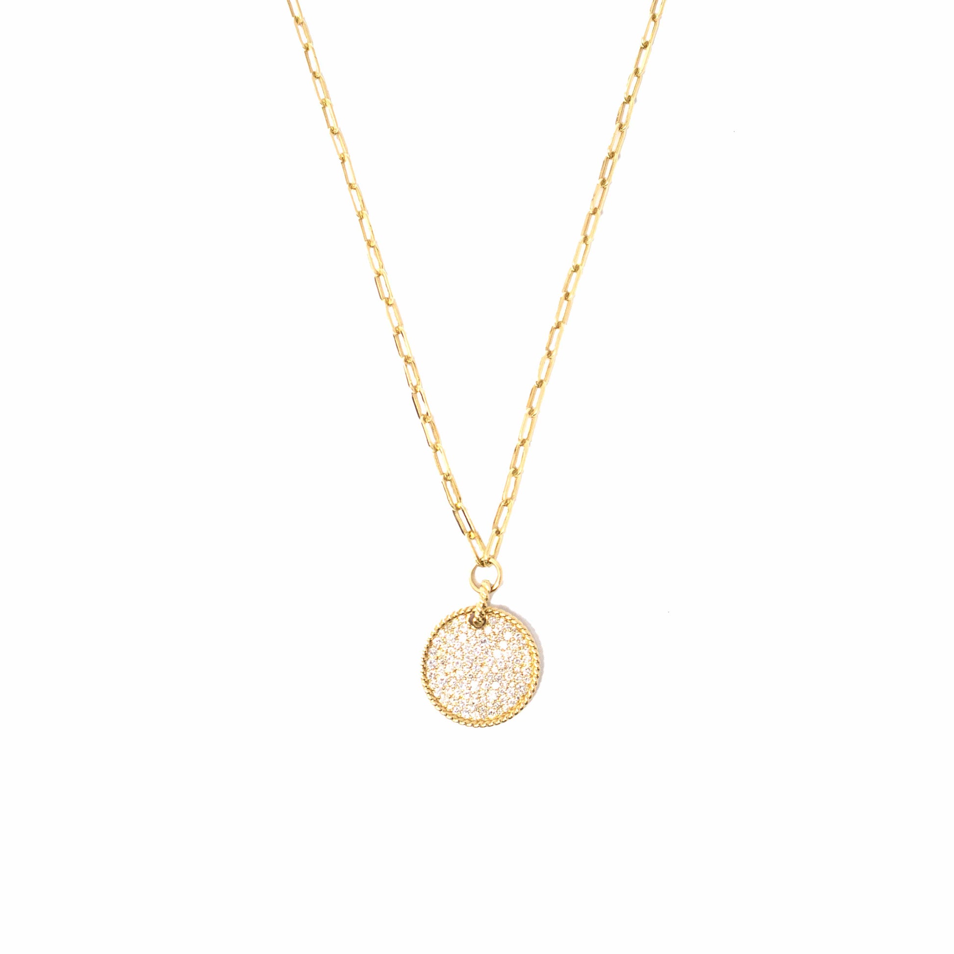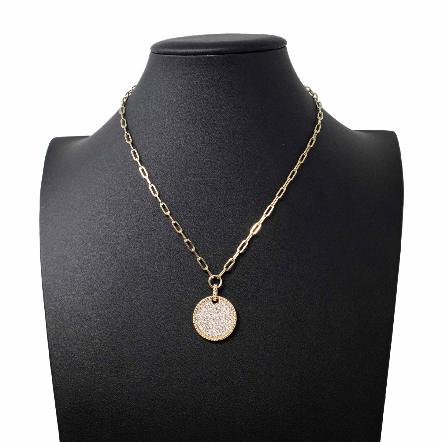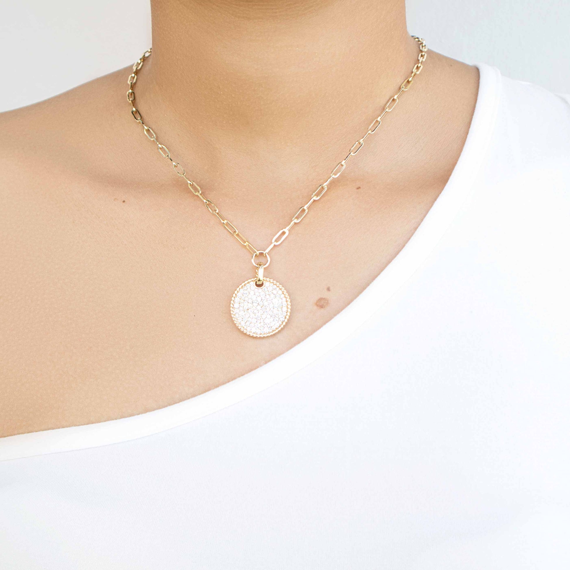 Classic take on a trendy design. Pave diamond disk necklace with a sophisticated pendant will make a beautiful and bold statement whether you wear it alone, or flaunt your style with a layering stack.