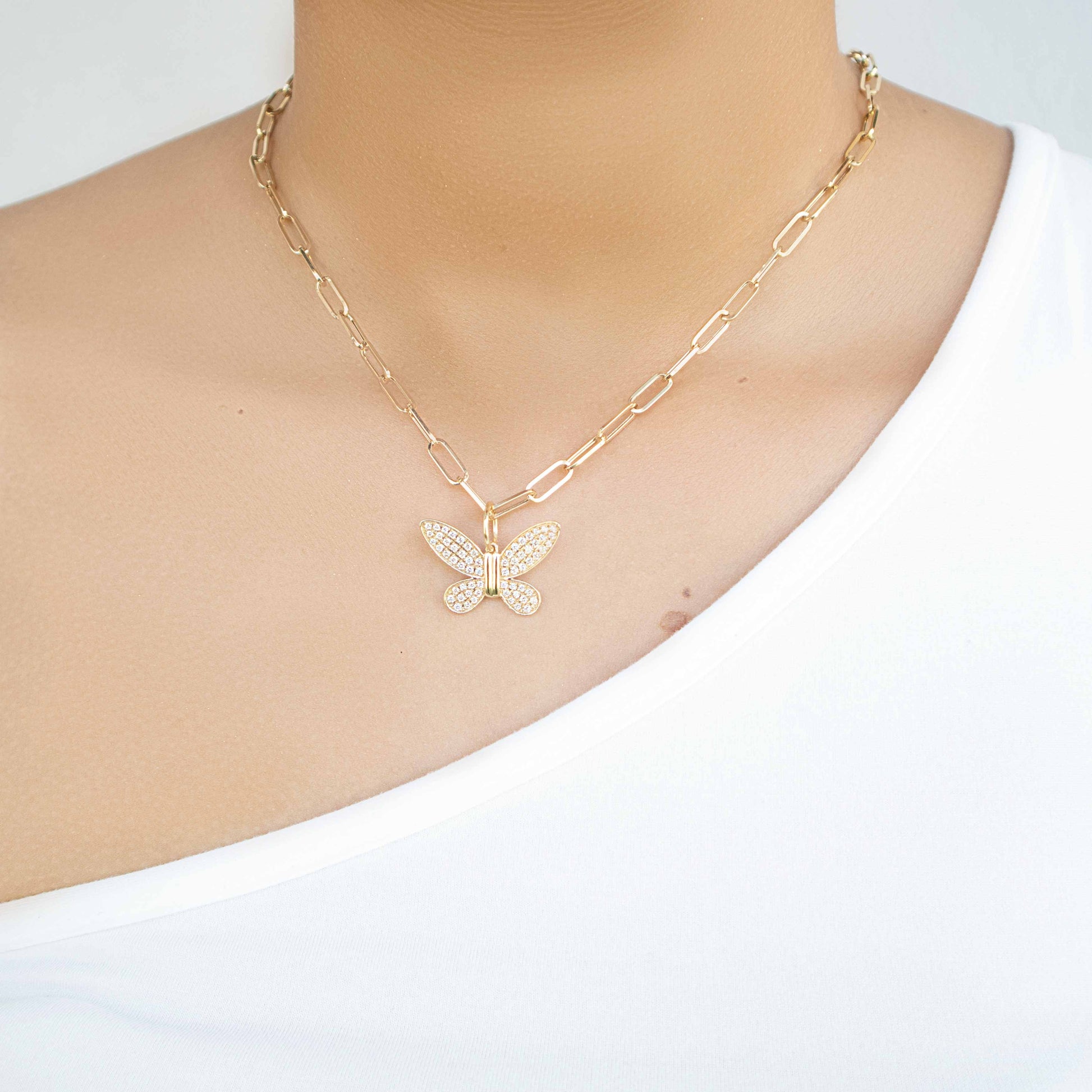 Transform your looks from dull to delightful with the pave diamond large butterfly pendant. A symbol of transformation and positivity, wear it when you need to break free and expess yourself without hesitation. In the presence of butterflies, magic thrives.