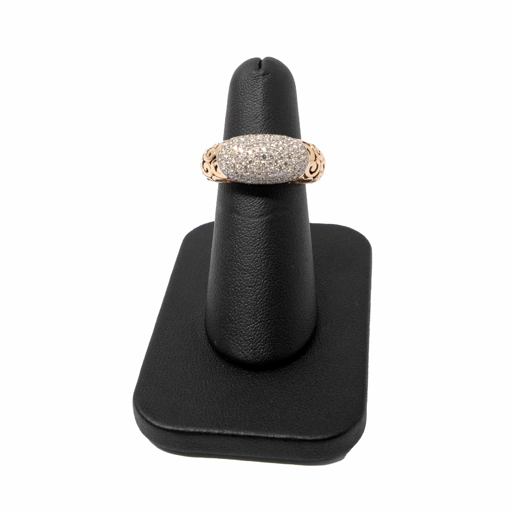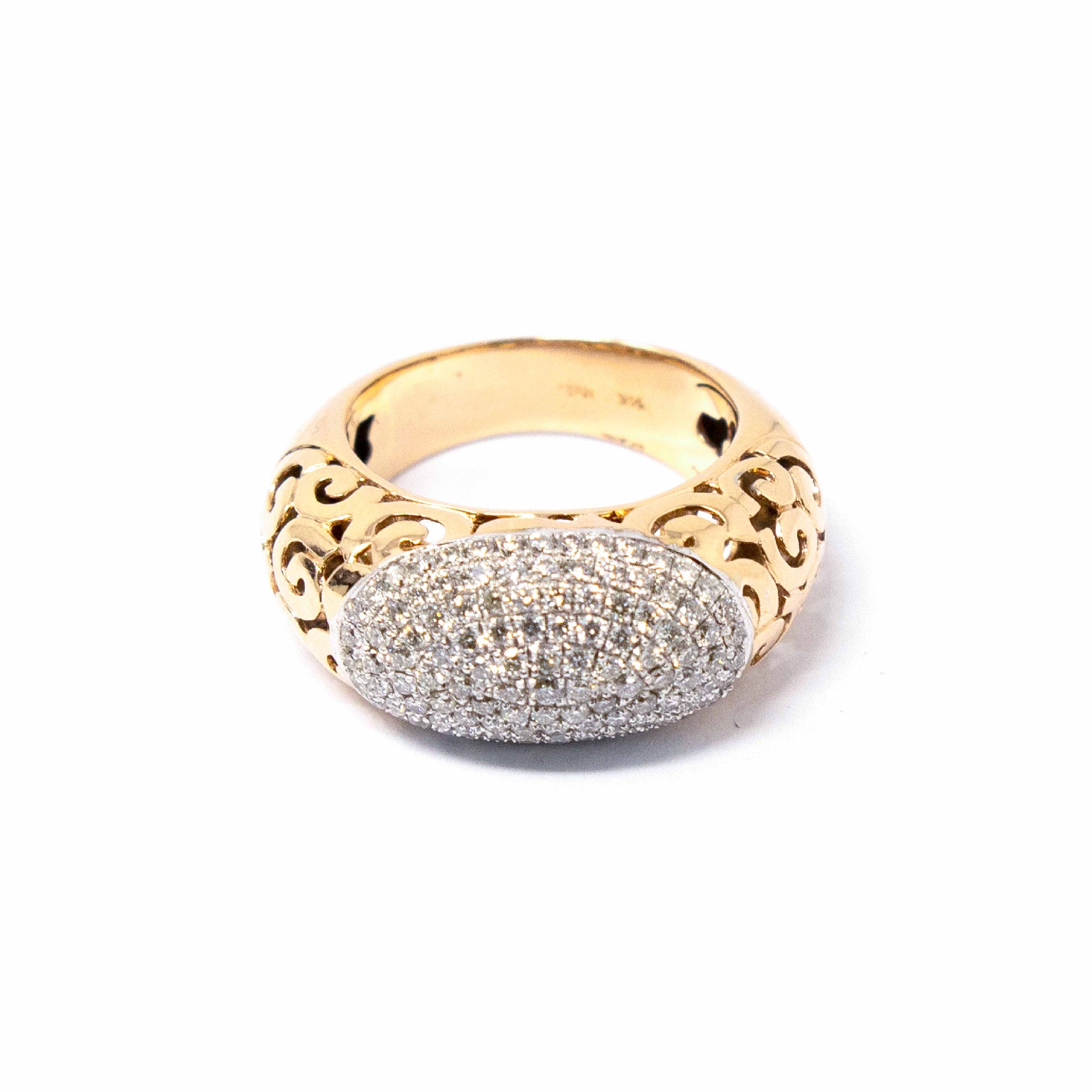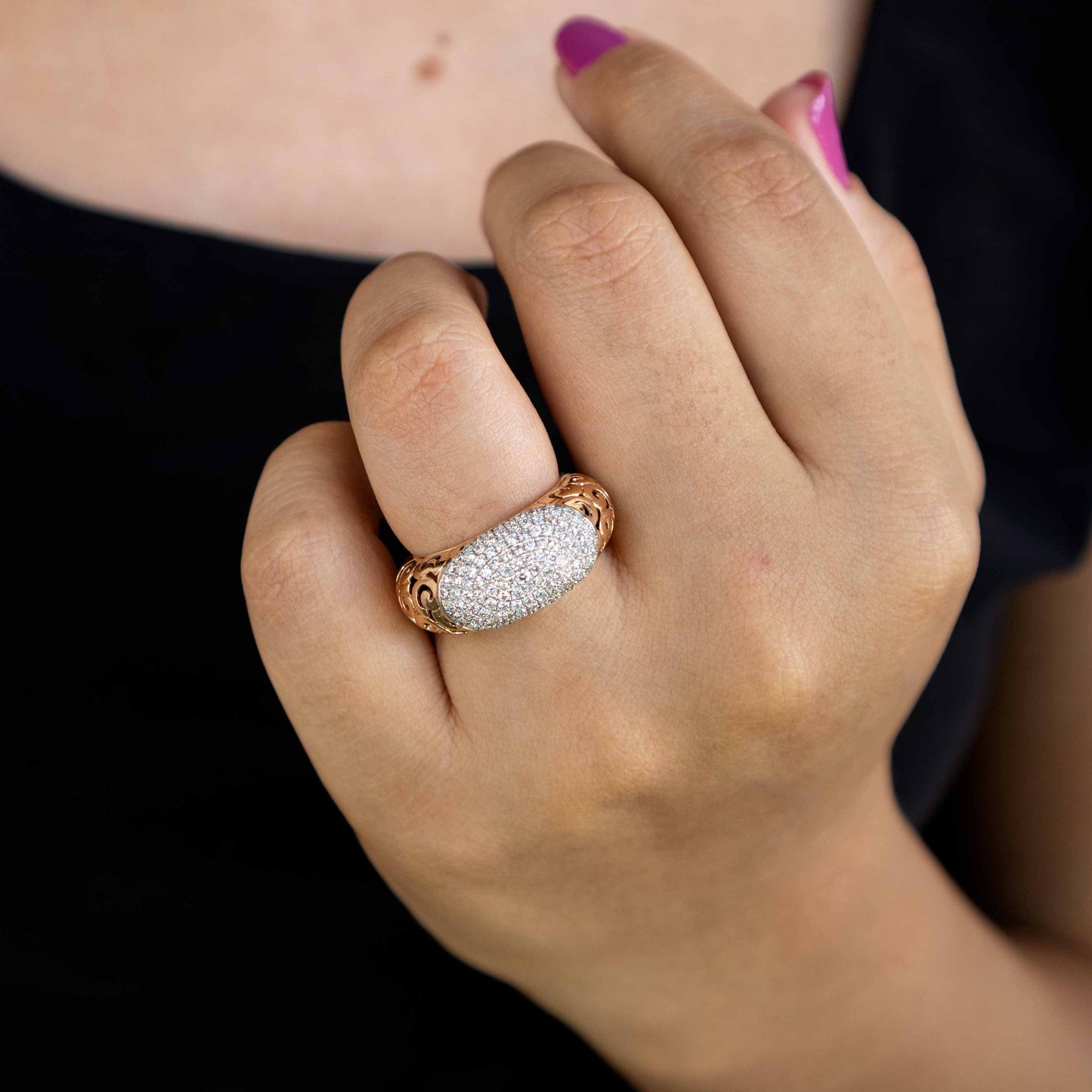 Classy and sassy, this diamond pave ring is a must-have. Beautiful hand crafter dome ring in 14 karat rose gold covered in pave diamonds a perfect statement piece for any occasion. With a hollow inside making the ring light and comfortable to wear. A true showstopper!