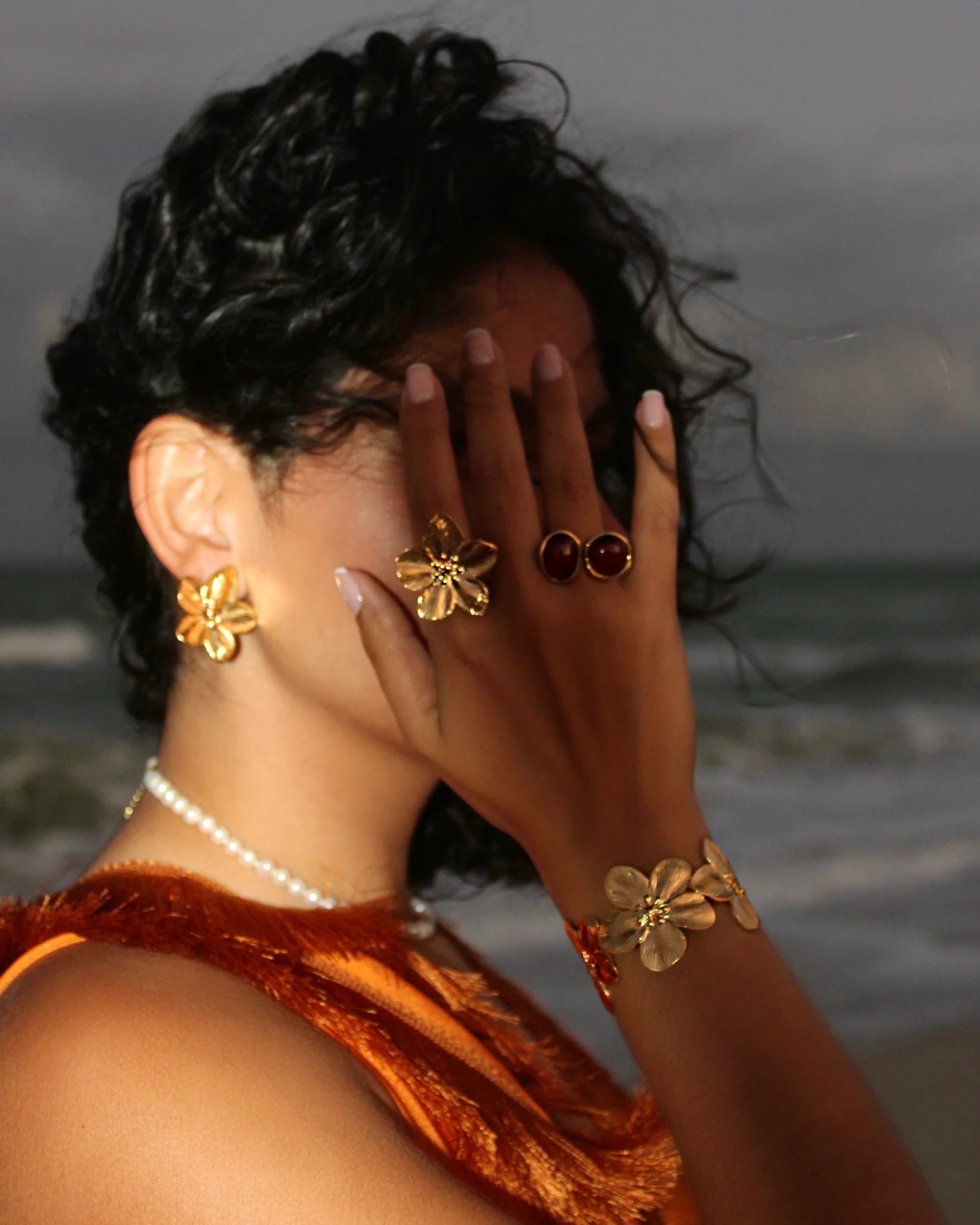 - Our Chic Flower Cuff Bracelet is a radiant and charming accessory. Crafted with a layer of durable and lustrous 18k gold plating. Our cuff is fully adjustable. It captures the beauty and vibrancy of Flowers. They are a perfect choice for adding a touch of elegance and nature-inspired style to any outfit. Water-resistant and the perfect statement piece.