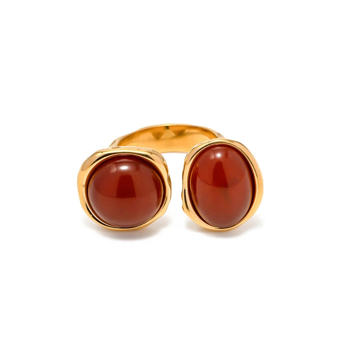 - Elevate any look with our stunning Red Jasper Open Ring, a true statement piece that complements any outfit. This ring is fully adjustable for a perfect fit and is elegantly crafted with 18k gold plating, adding a touch of luxury to your look. Its water-resistant design ensures durability and longevity, making it a versatile accessory for any occasion. Add a touch of color to your look with this exquisite Red Jasper open ring.