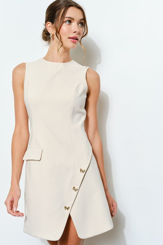 Asymmetrical Mini Dress with Bow Accents, Sleeveless design with a round neckline, chic asymmetrical wrap-style front, gold-tone bow embellishments for a feminine touch, faux flap pocket detail far added style, perfect for brunch, date nights, or semi-formal events.