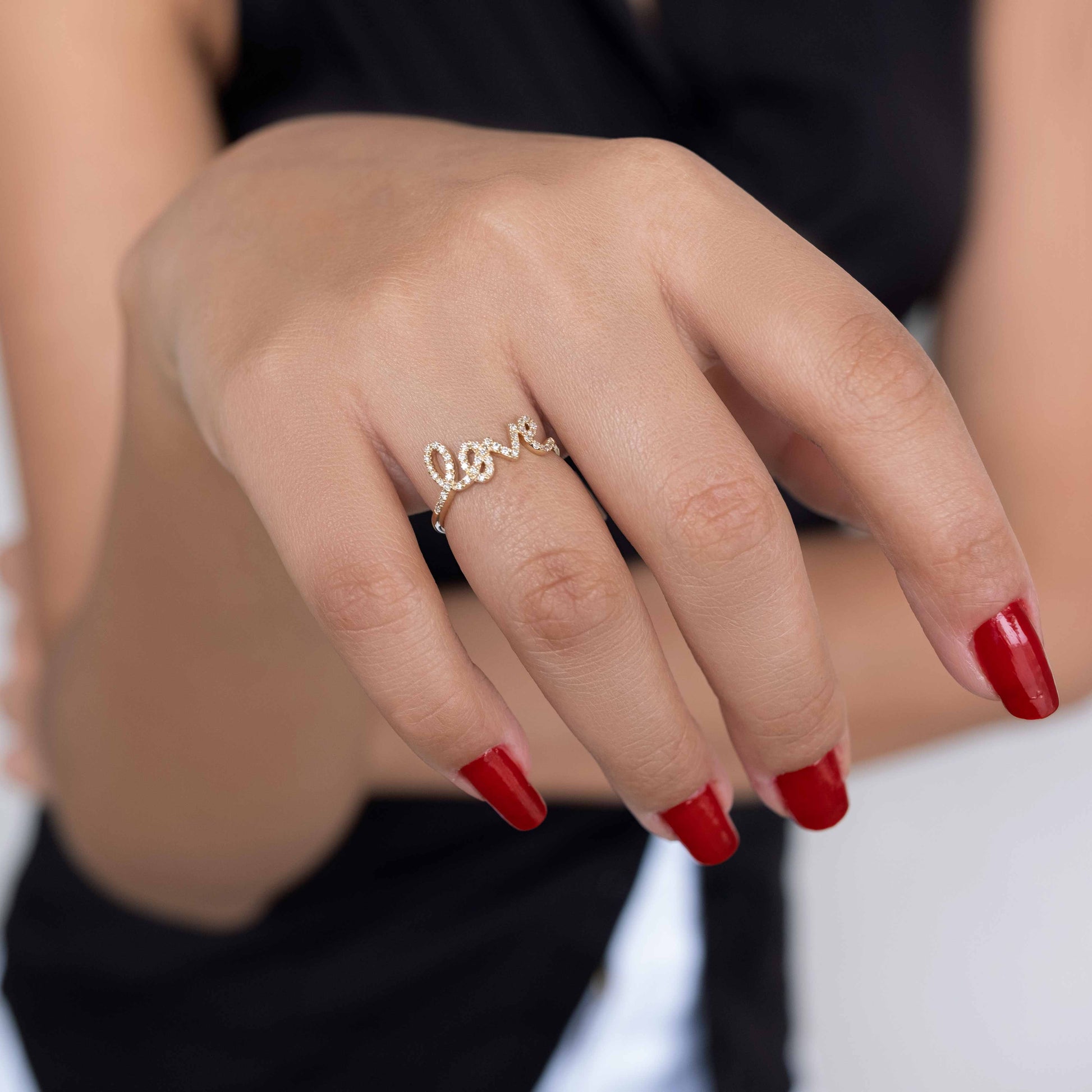 Express yourself with this celebration of love ring. A perfect gift for a special anniversary or milestone, this dainty ring is cast from 14k gold and encrusted with 0.21 carrots of brilliant-cut diamonds. Wear yours solo or stacked with other pieces.