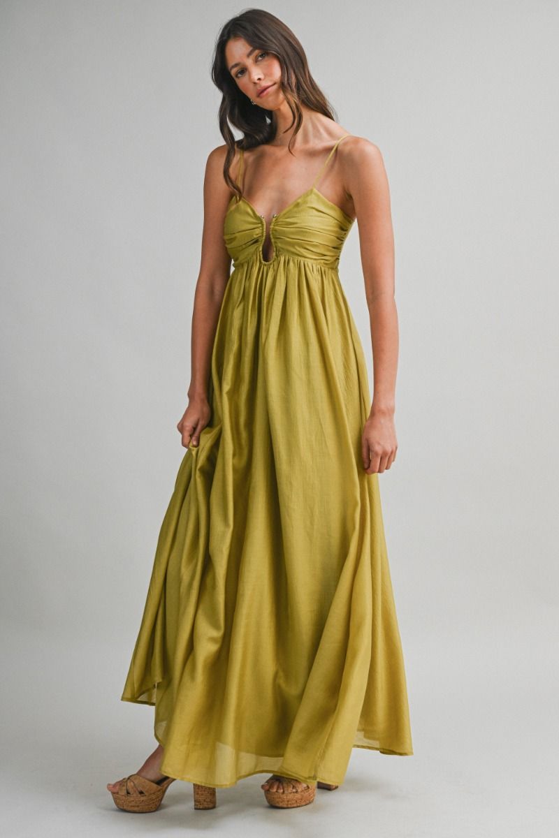 Flowy maxi dress featuring a ruched bust detail with a front keyhole and metal bust detail with a front keyhole and metal bead accent. Designed with adjustable spaghetti straps, smocked back and invisible zipper. Fully lined.