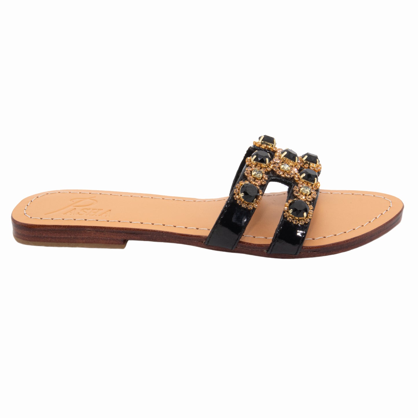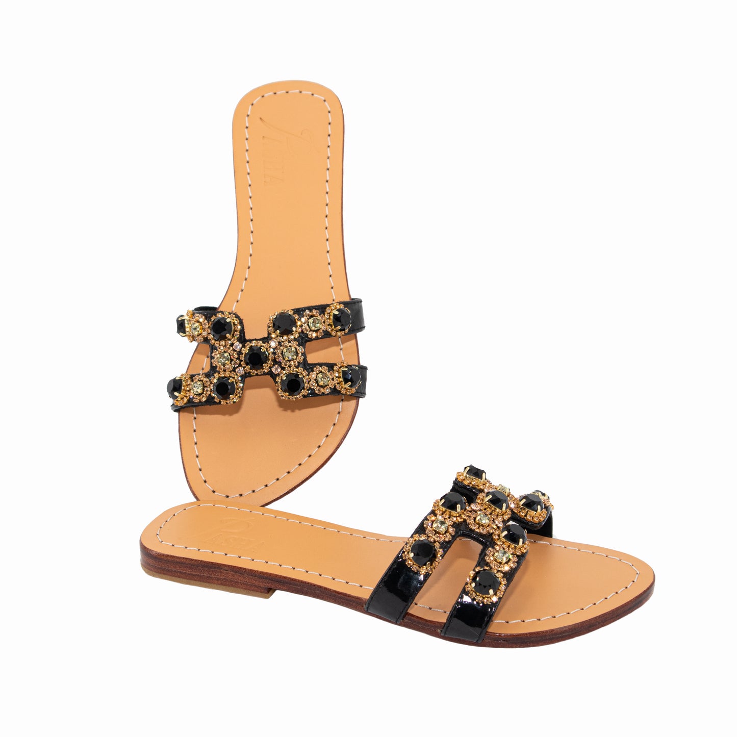 - Embellished Sandals for women that will have you shining all day. The HATIYA sandal slide is made with jet Black Crystals, Gold Rhinestones and a metallic Black Leather Strap.