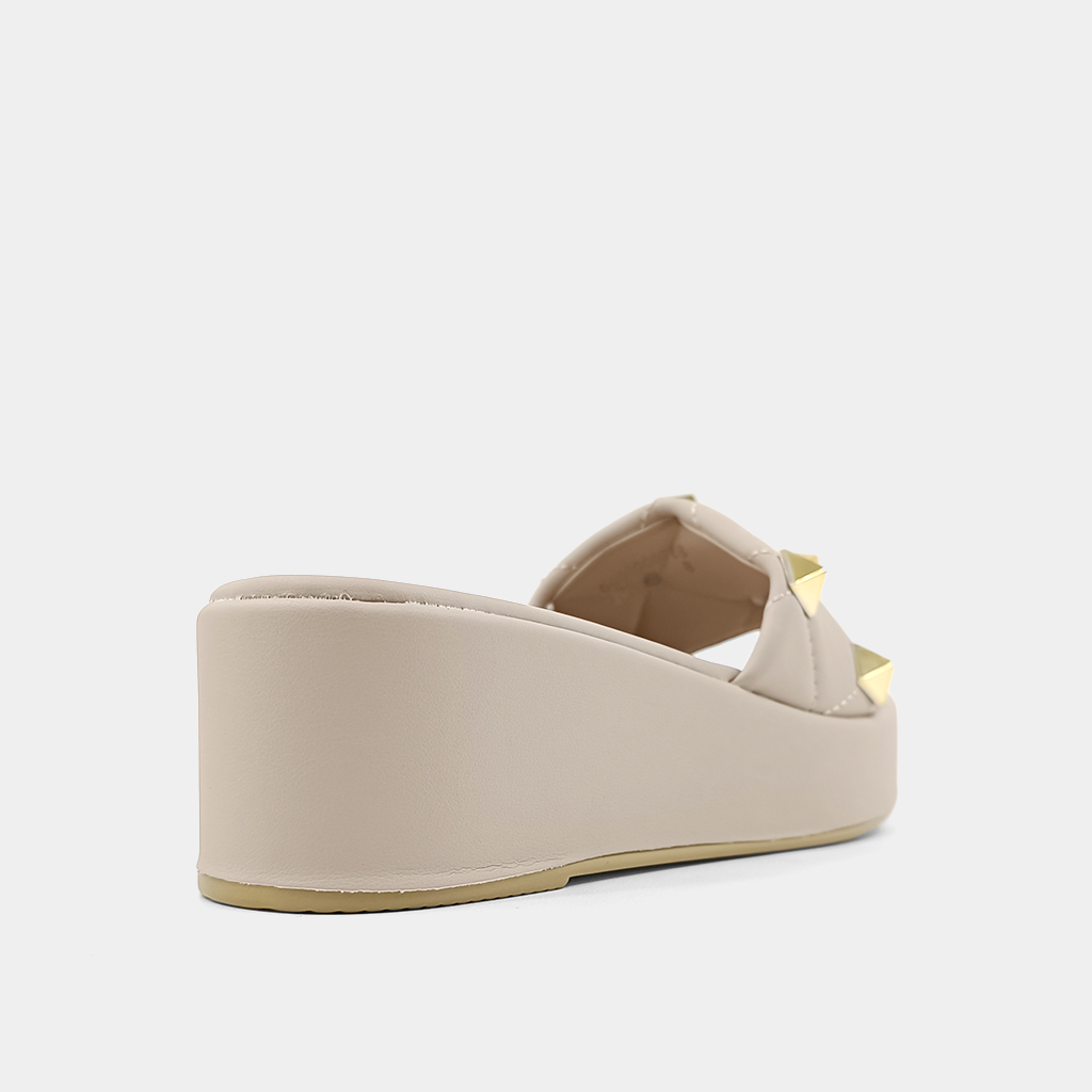 These nude colored Joplin sandals are set on a cushions wedge heel. covered in Saul faux leather, and sprinkled with oversized pyramid studs, you can wear these with anything from denim dress.