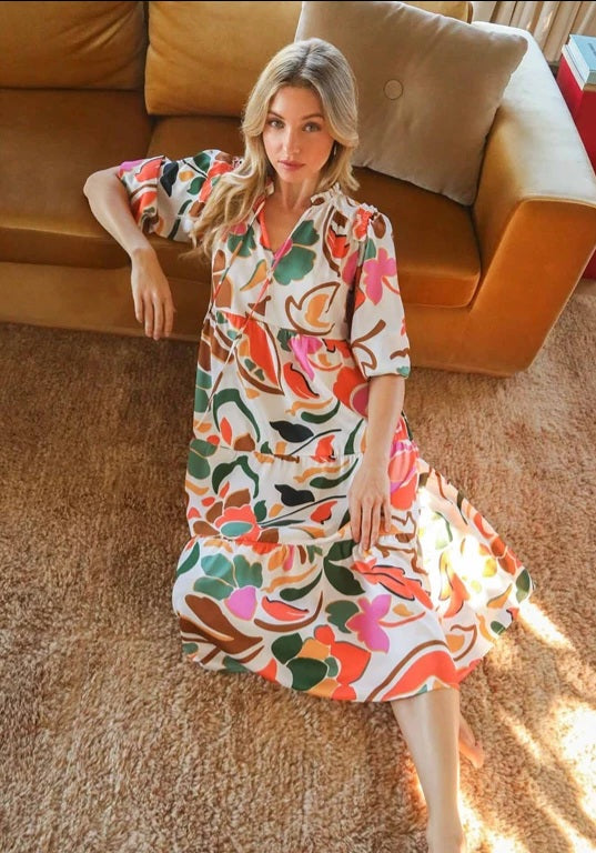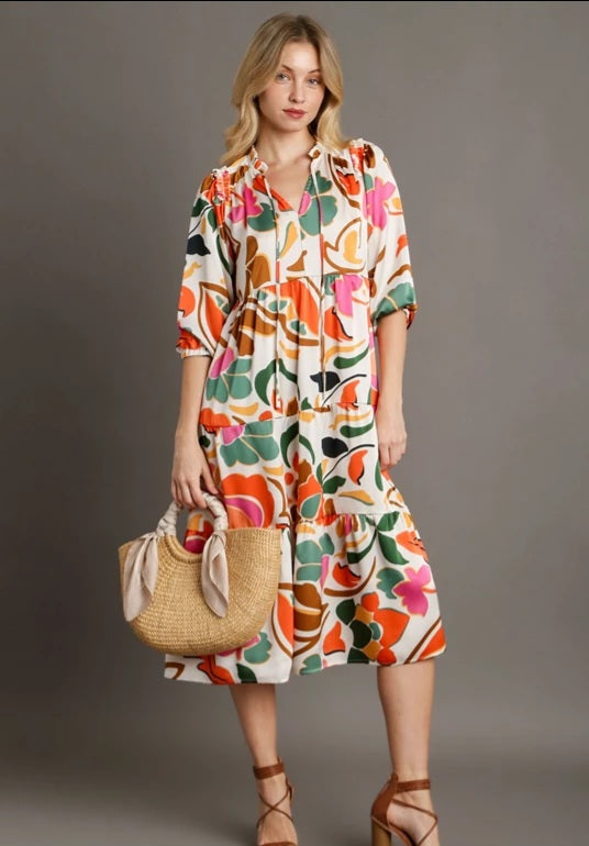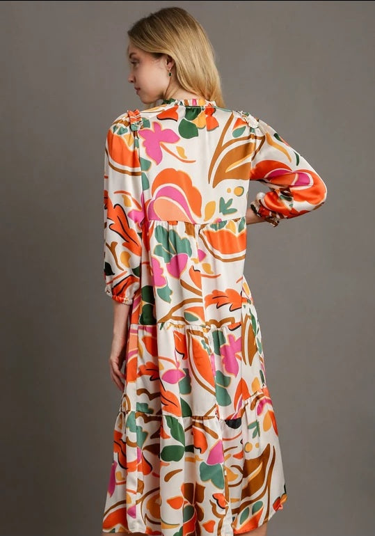 Umgee Abstract Satin Tiered Midi Dress with Bubble Sleeves, Ruffle Neckline