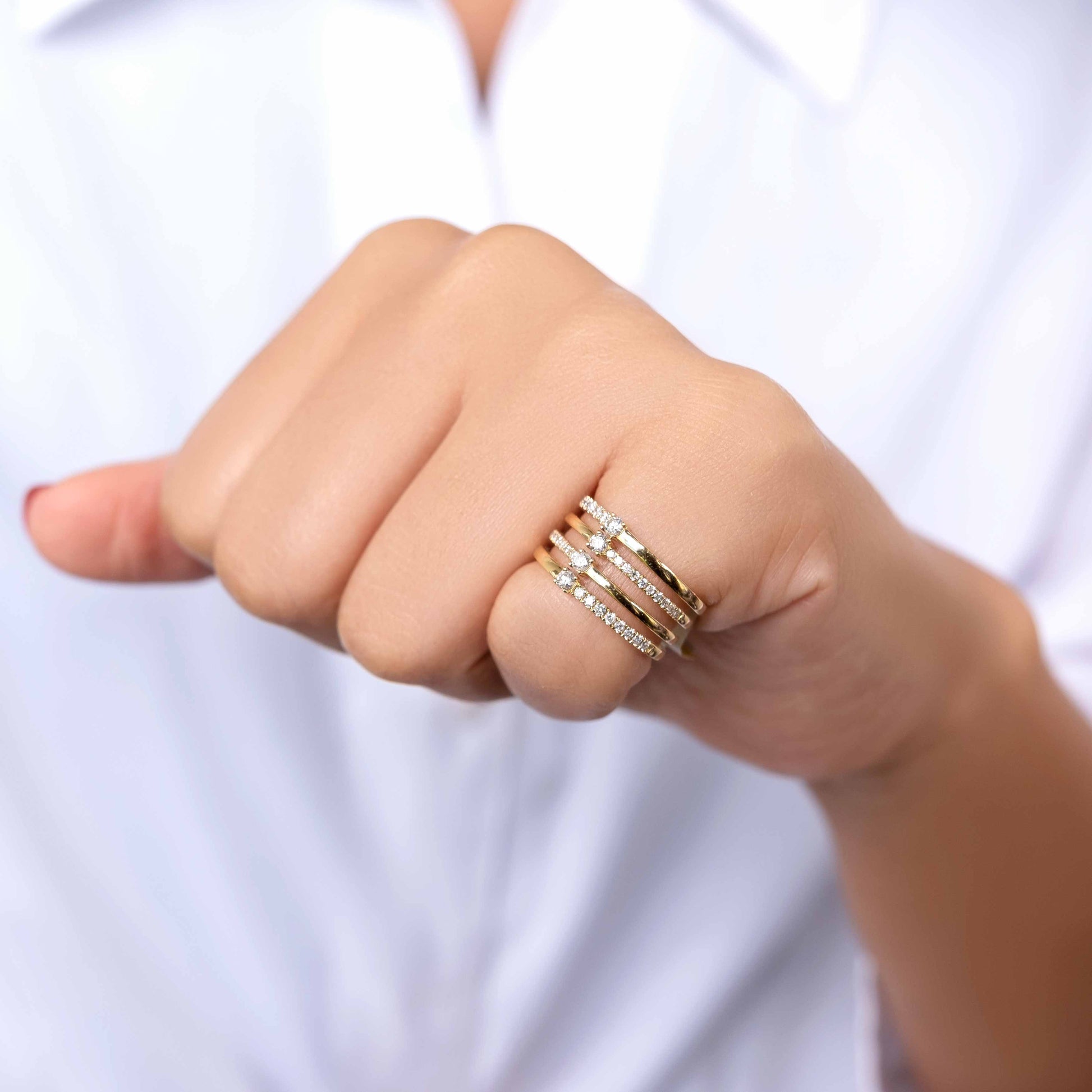 Layered diamond stack ring in 18k yellow gold, with a total of four separate bands complementing one another, this perfectly curated stack will never spin to face the wrong way. Additional round cut diamonds are set into an embellishment and add to the design and sparkle. Perfect for everyday wear, yet could easily be dressed up for fine evening wear.