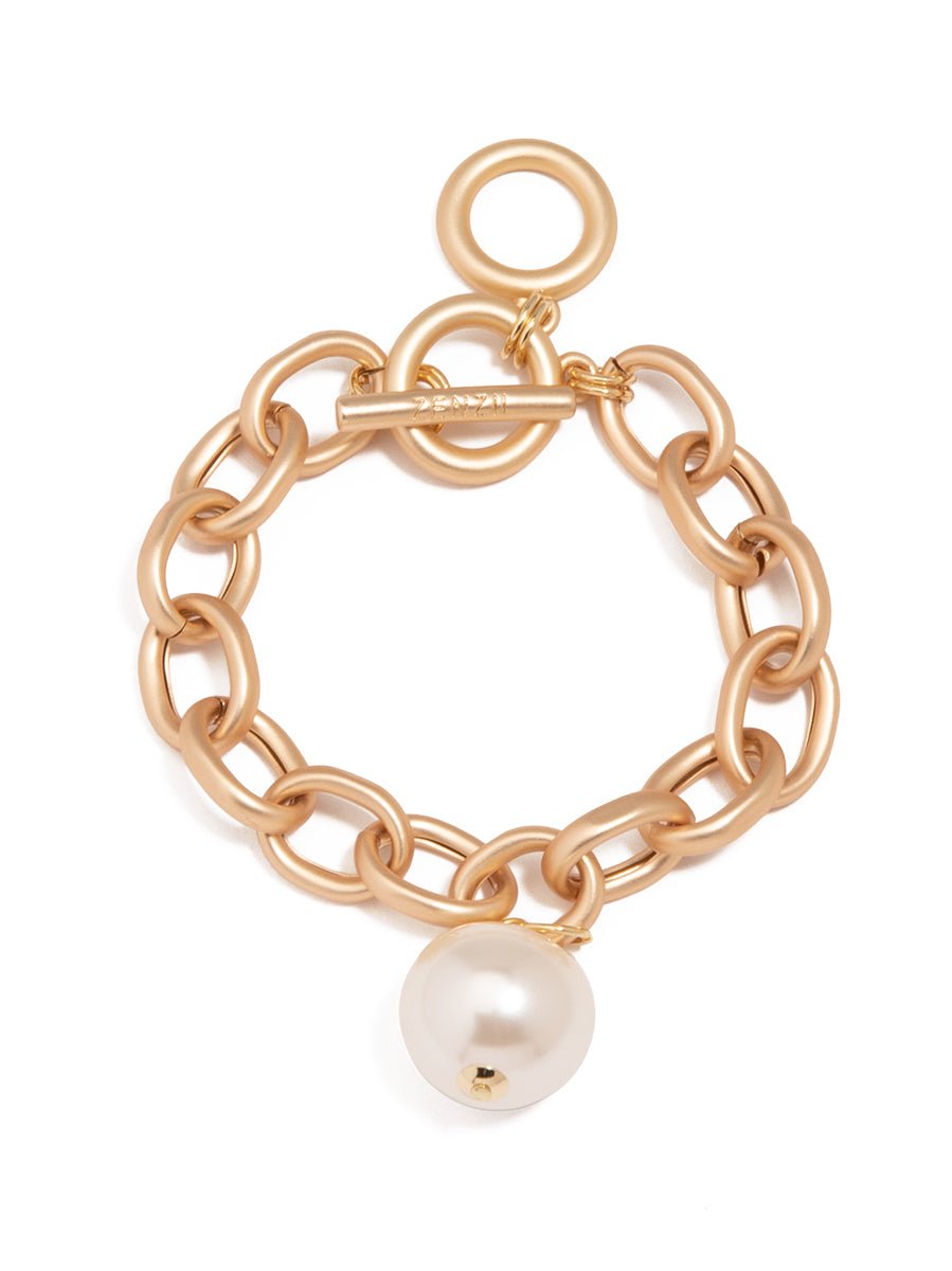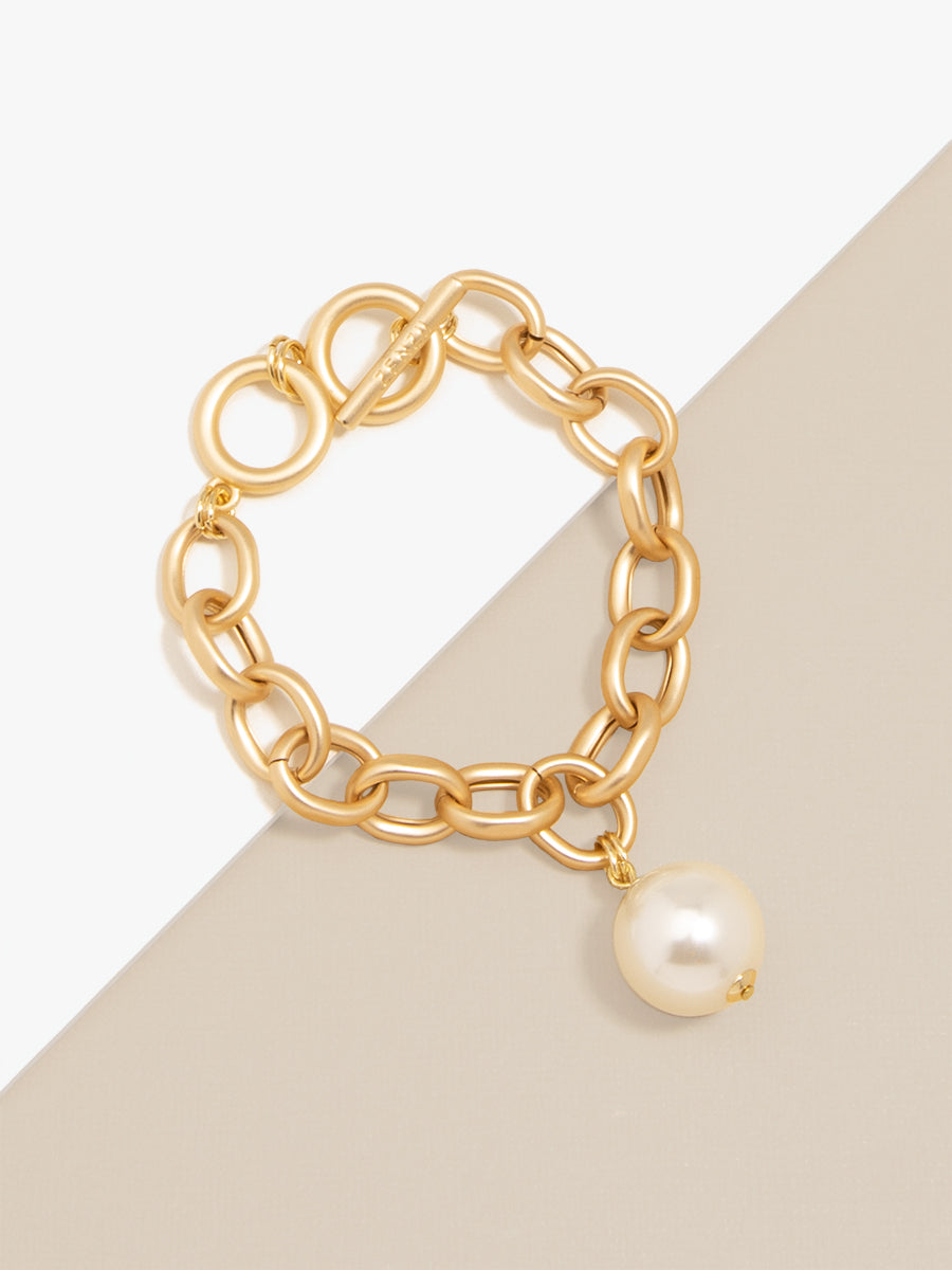 Chunky oval link chain bracelet designed with an oversized pearlescent bead charm and toggle style closure.