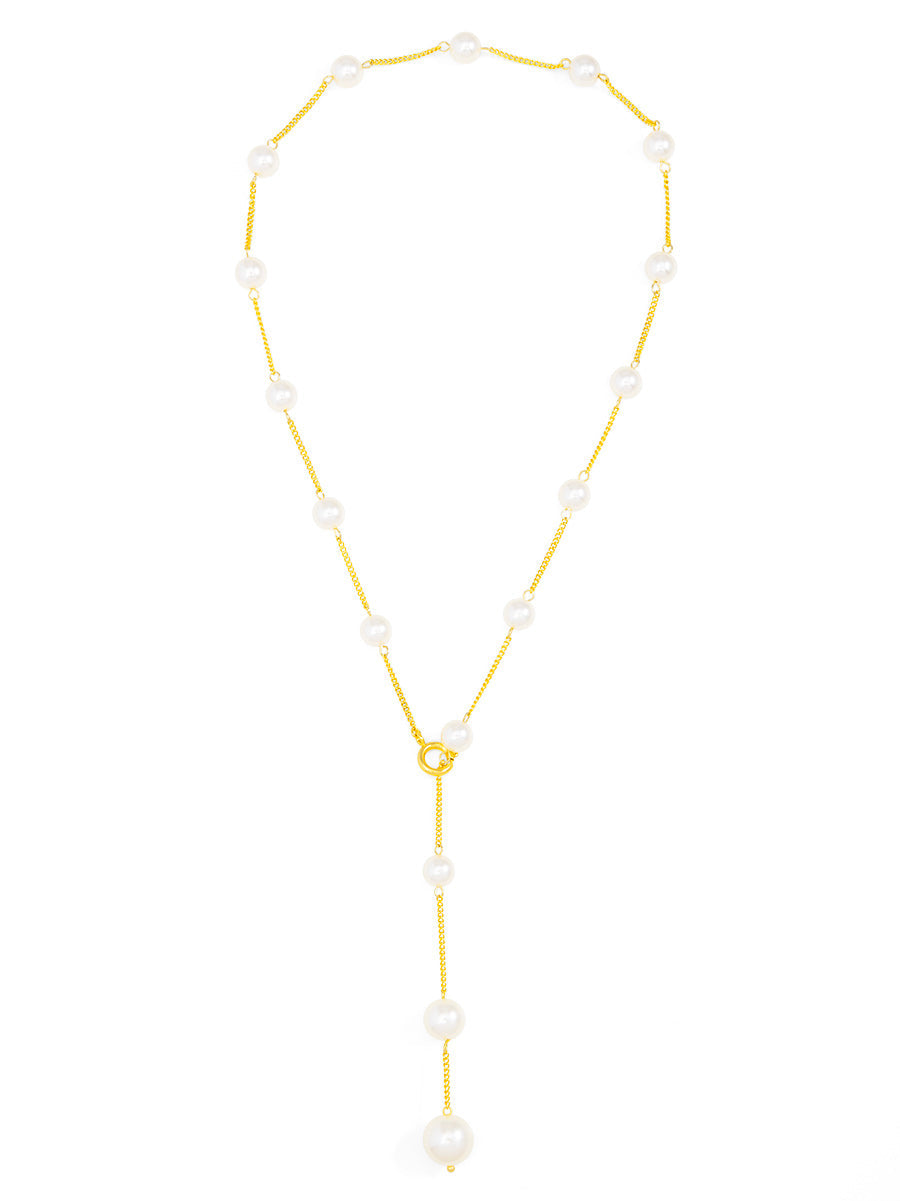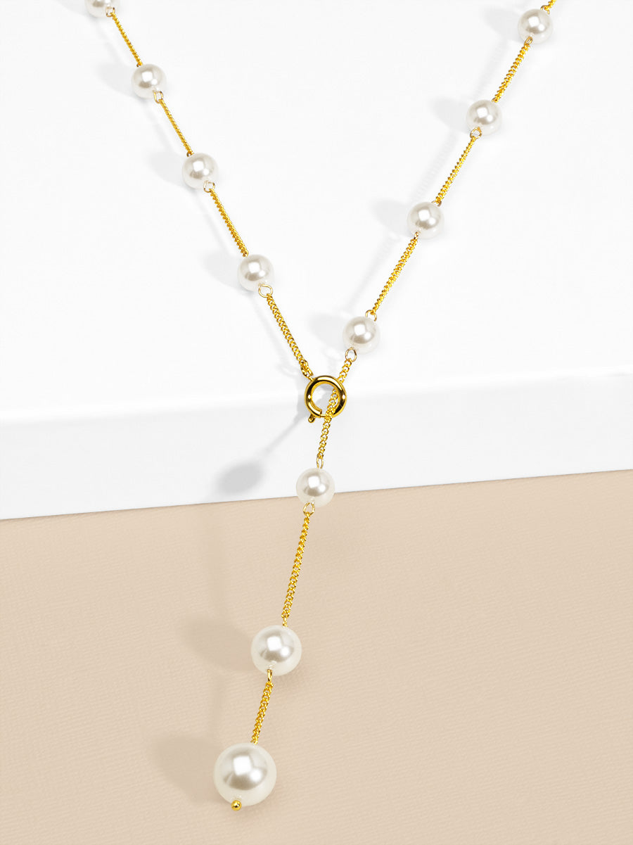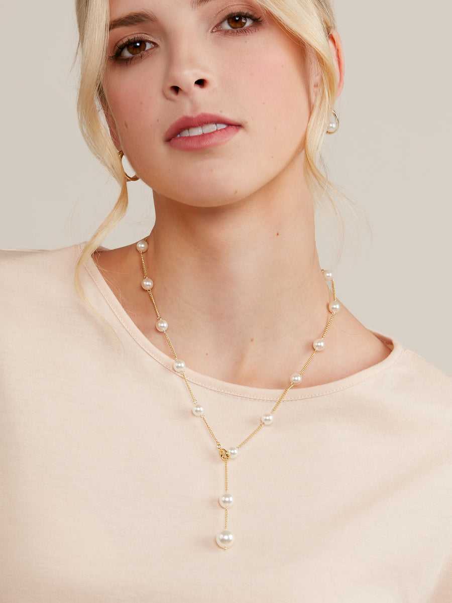 Pearl embellished necklace can be worn in a traditional collar style or as a lariat.